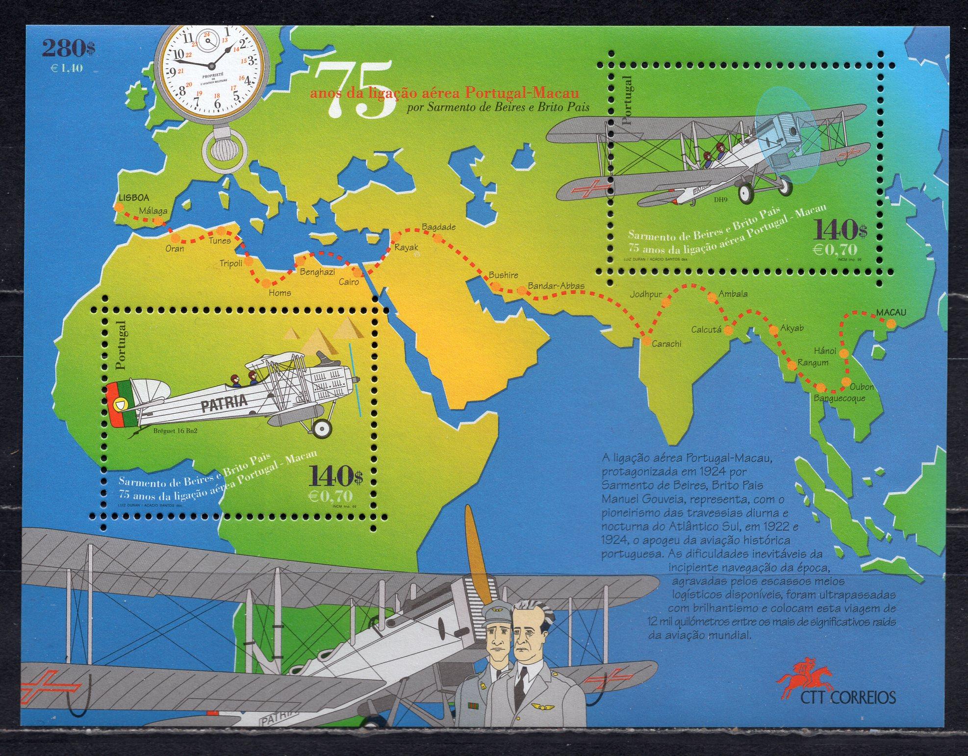 Почтовые марки. Португалия, 1999 г. Самолёты. Карты. Бл. 148.