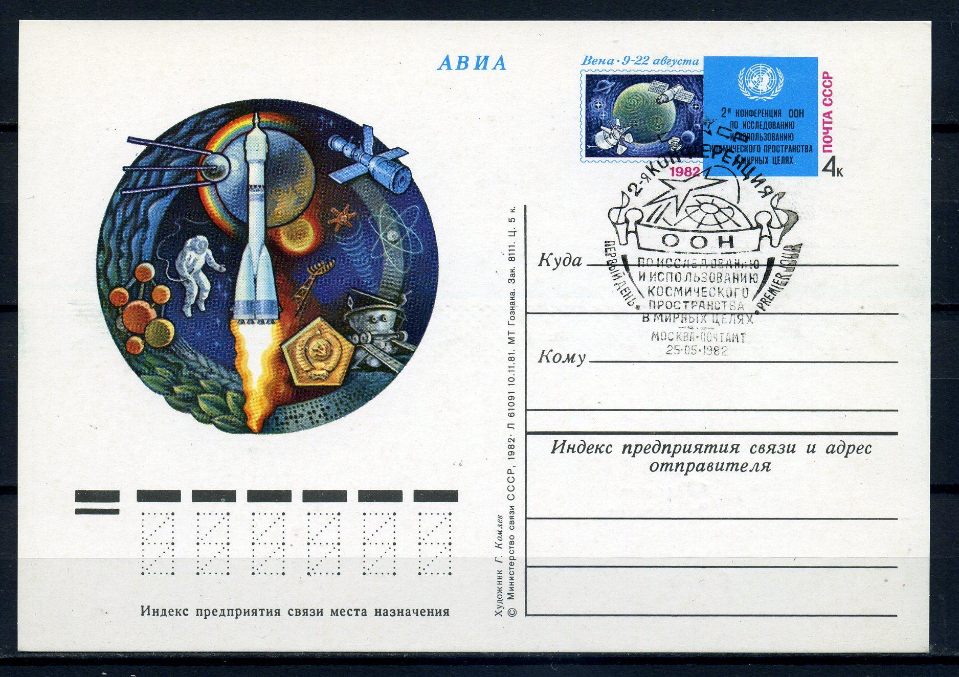 Почтовая карточка с ОМ и СГ. СССР 1982 г. 2-я конференция ООН. Космос в мирных целях.