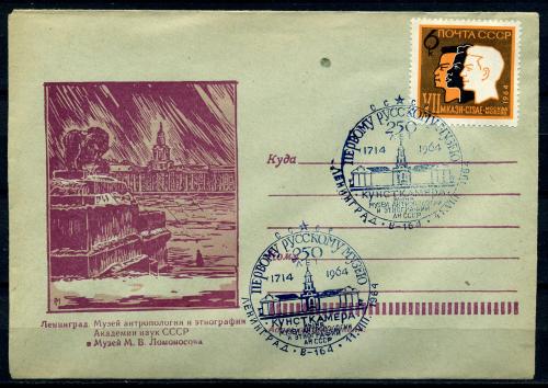 Немаркированный конверт с маркой и СГ. СССР 1964 г. 250 лет Кунсткамере. КЗ.