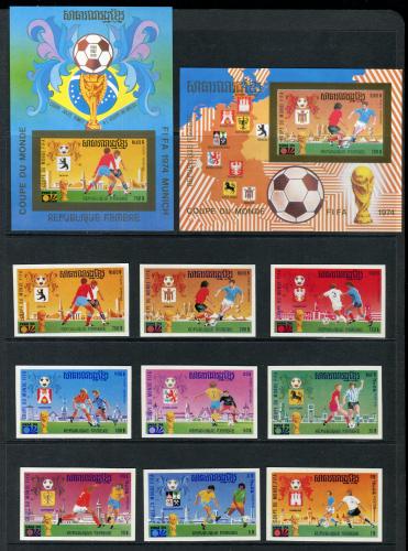 Почтовые марки. Камбоджа, 1975 г. №420-428 b, Бл.83-84b. Футбол. беззуб. (Mi 100.00€)