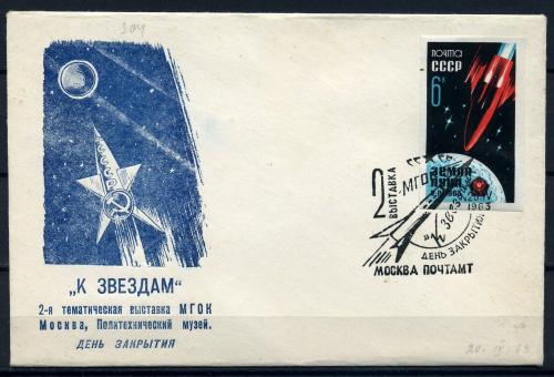 Конверт с маркой и СГ. СССР 1963 г. "К звездам". 2-я тематическая выставка МГОК. День закрытия. КО.