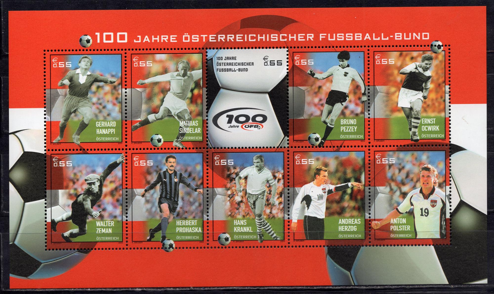 Почтовые марки. Австрия, 2004 г. Футбол. №2460-2469. МЛ.