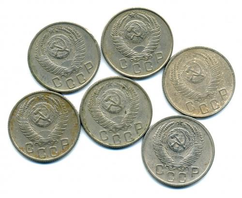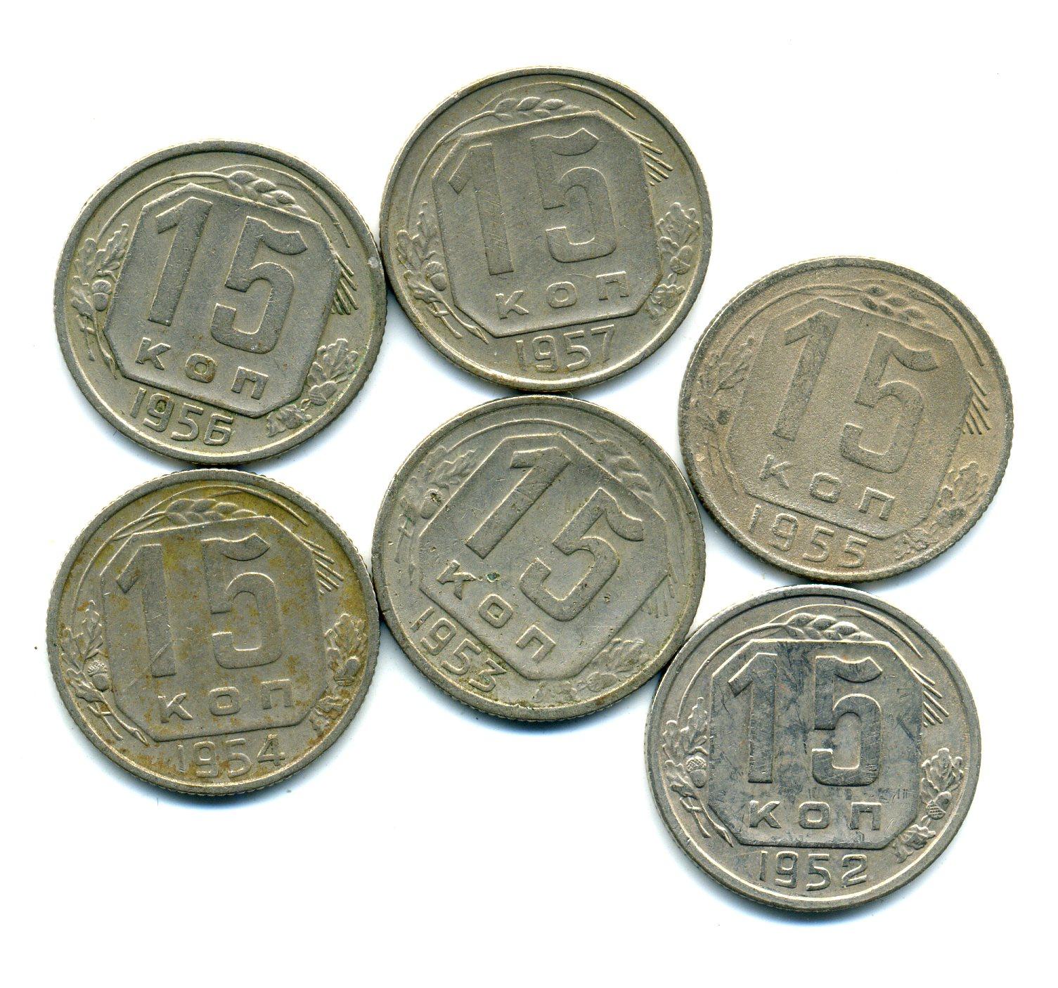 Монеты СССР. 15 копеек 1952-1957 г. 6 шт.