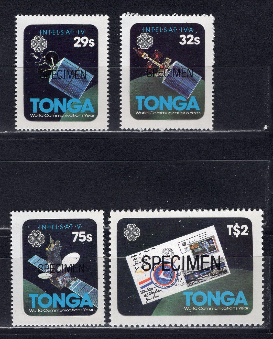 Почтовые марки. Тонга. 1983г. Космос. Коммуникации. Надпечатка SPECIMEN. №855-858. Самоклейки (Mi: 8.00 Евро)