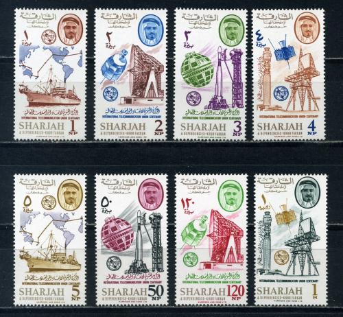 Почтовые марки. Шарджа. 1965г. ITU. Спутниковая связь. Космос. №185-192.