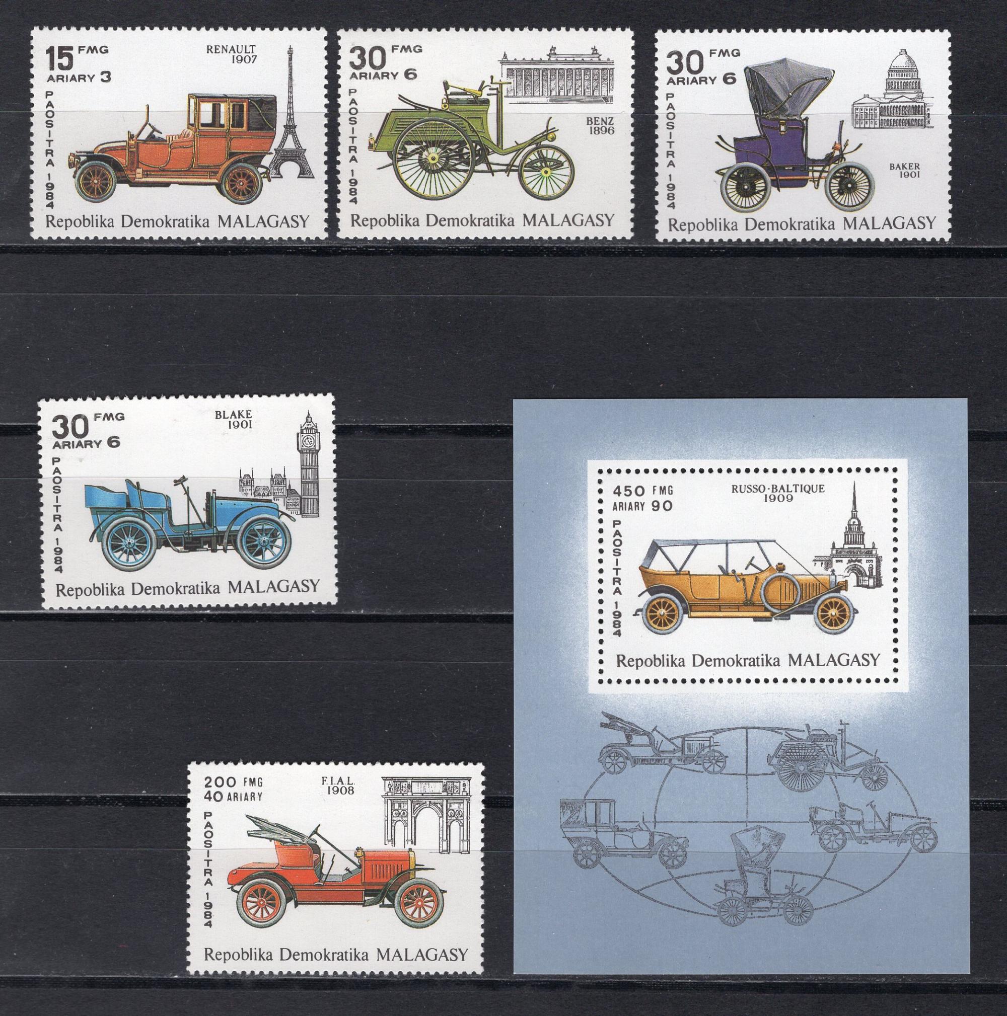 Почтовые марки. Мадагаскар. 1984г. Автомобили. №938-942. Блок №24.