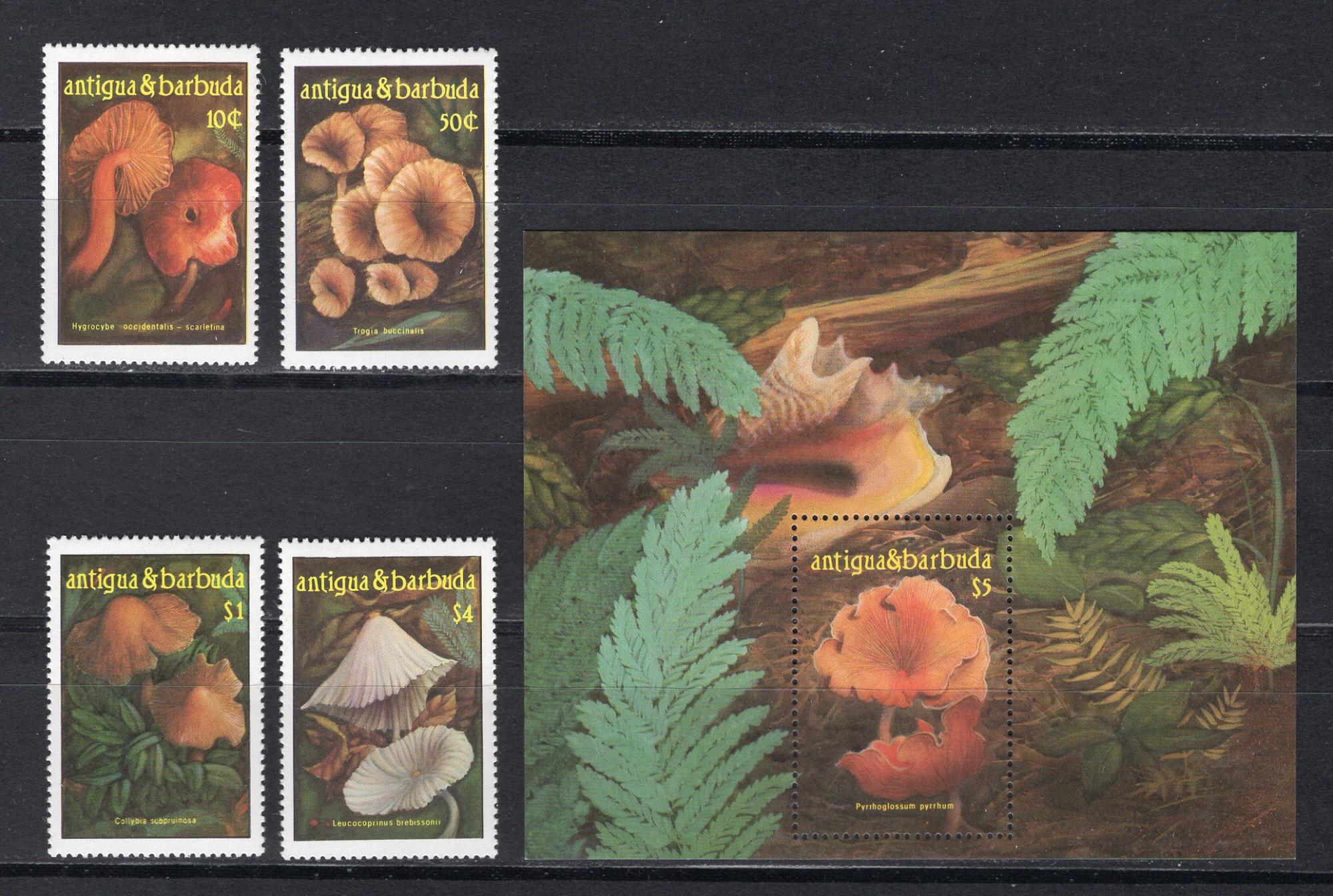 Почтовые марки. Антигуа и Барбуда. 1986г. Грибы. №973-976. Блок №116 (Mi: 19.00 Евро).
