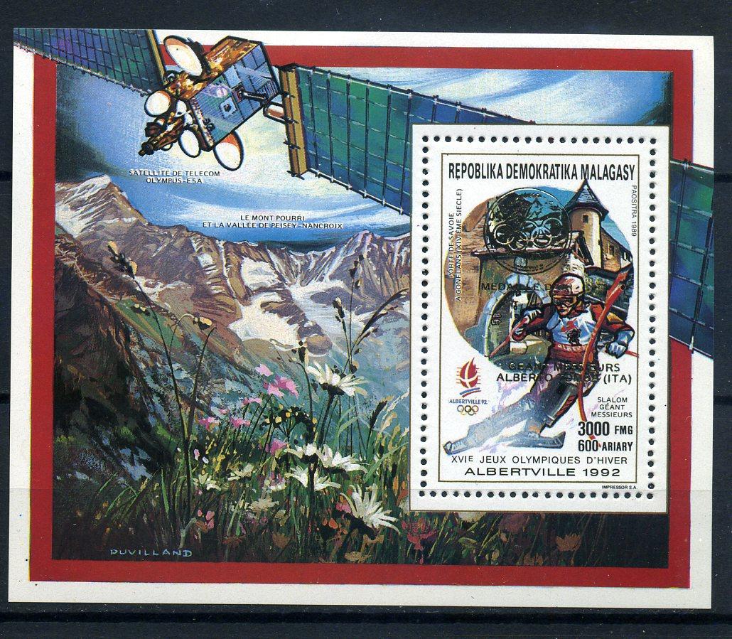 Почтовые марки. Мадагаскар. 1993г. Блок №224. Олимп. игры. Альбервилль. Надпечатка. Лыжный слалом. Альберто Томба.