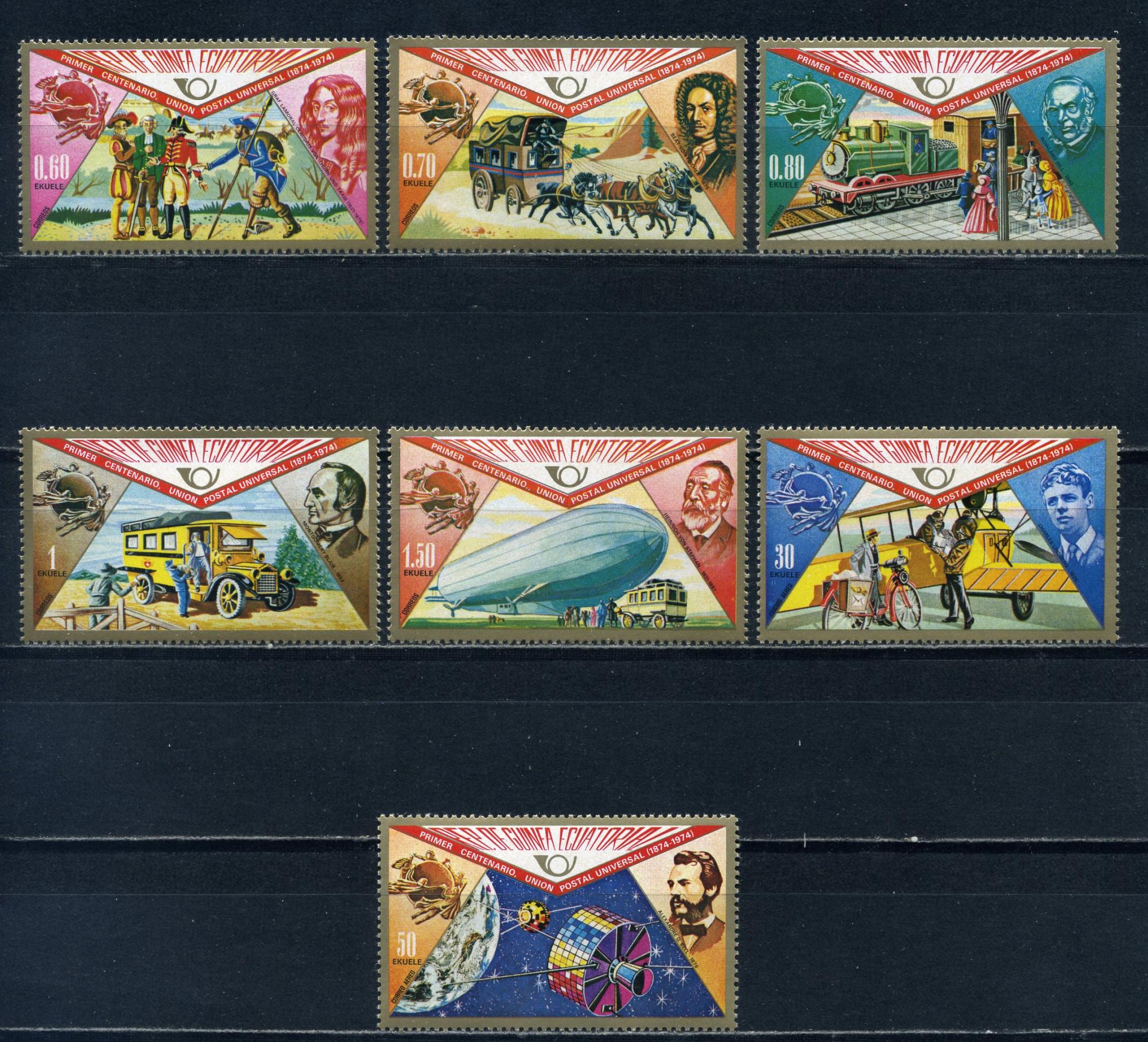 Почтовые марки. Экваториальная Гвинея. 1974г. 100-летие ВПС. Транспорт. №382-388.