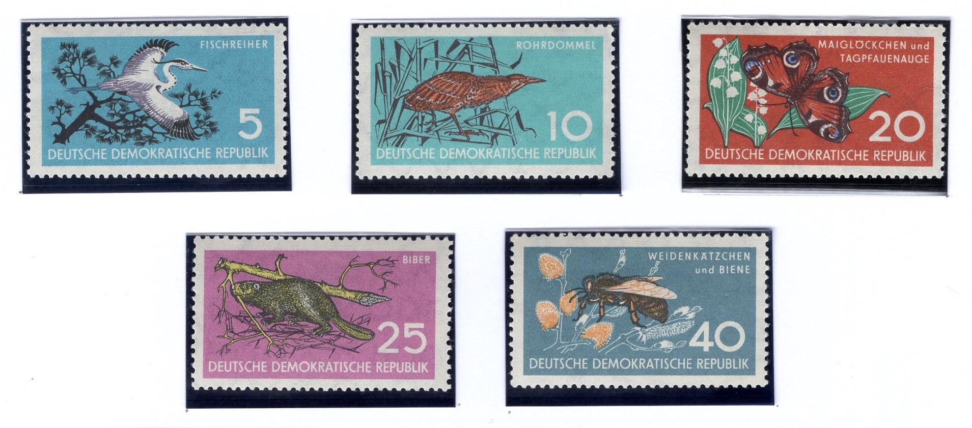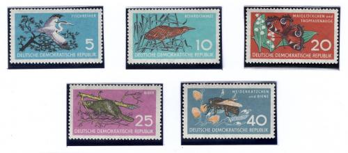Почтовые марки. ГДР, 1959 г. Птицы. Животные. Бабочки. №688-692. (12,02 е)