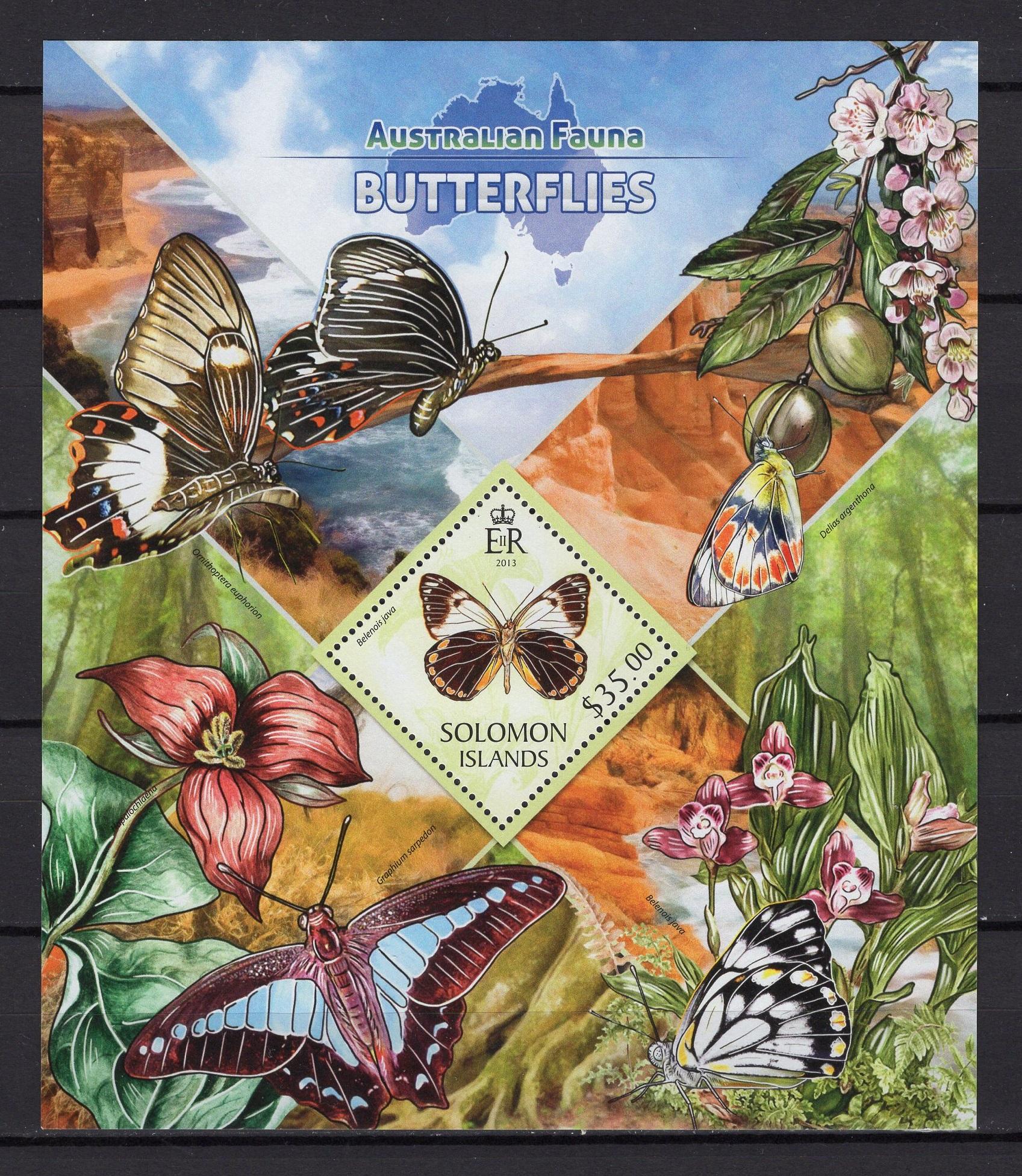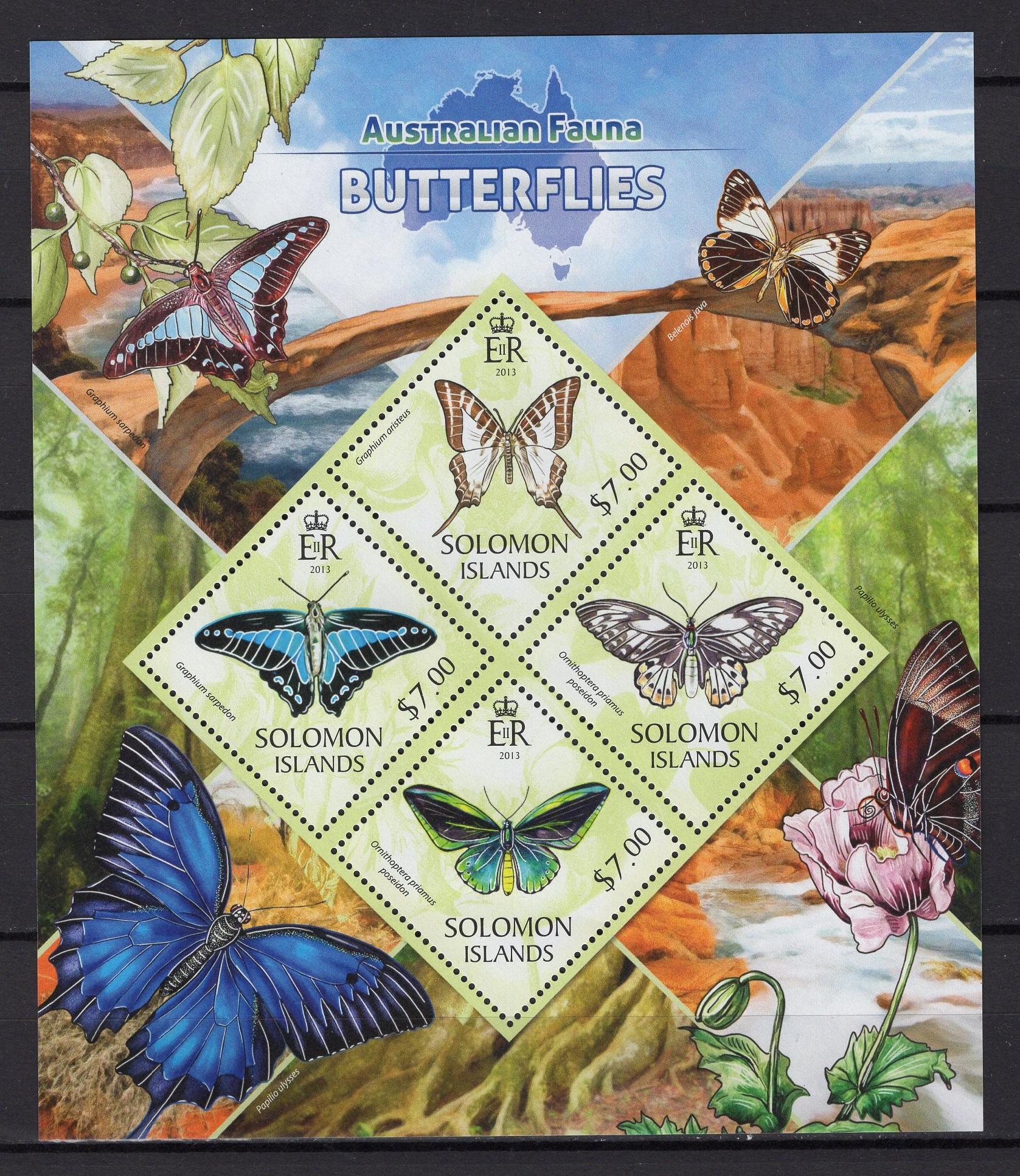 Почтовые марки. Соломоны, 2013 г. Фауна Австралии. Бабочки. №1897-1900, Бл. 166. (21,0 е)