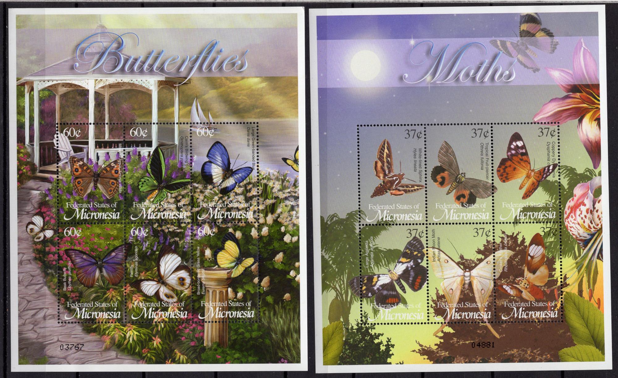 Почтовые марки. Микронезия, 2002 г. Бабочки. Мотыльки. 2 МЛ. №1352-1357, 1366-1371.