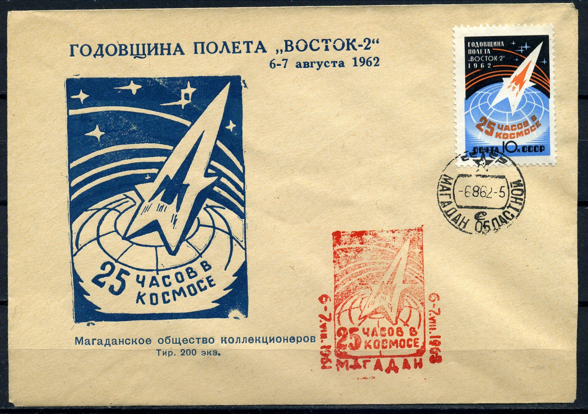 Конверт с маркой и СГ. СССР 1962 г. Годовщина полета "Восток-2". КО. Тир. 200 экз.