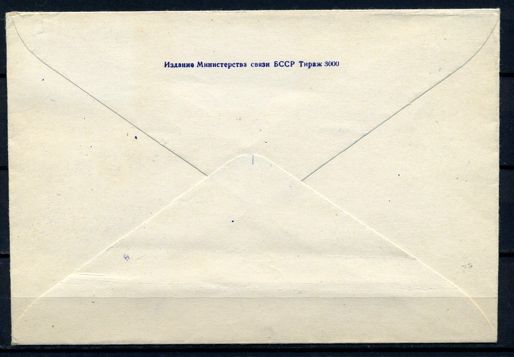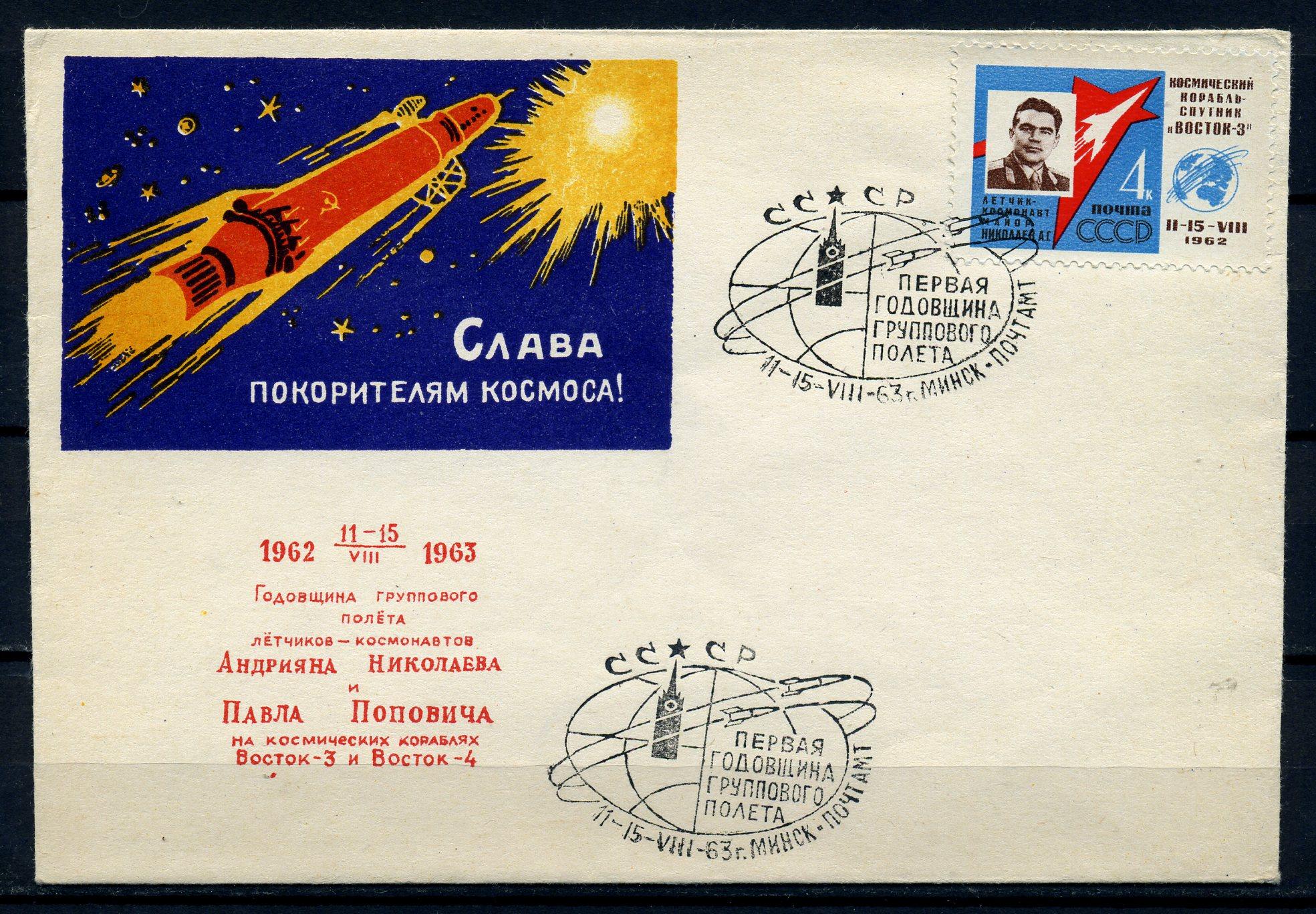 Конверт с маркой и СГ. БССР 1963 г. 1-я годовщина группового полета. "Восток-3". КО. тир. 3000 экз.