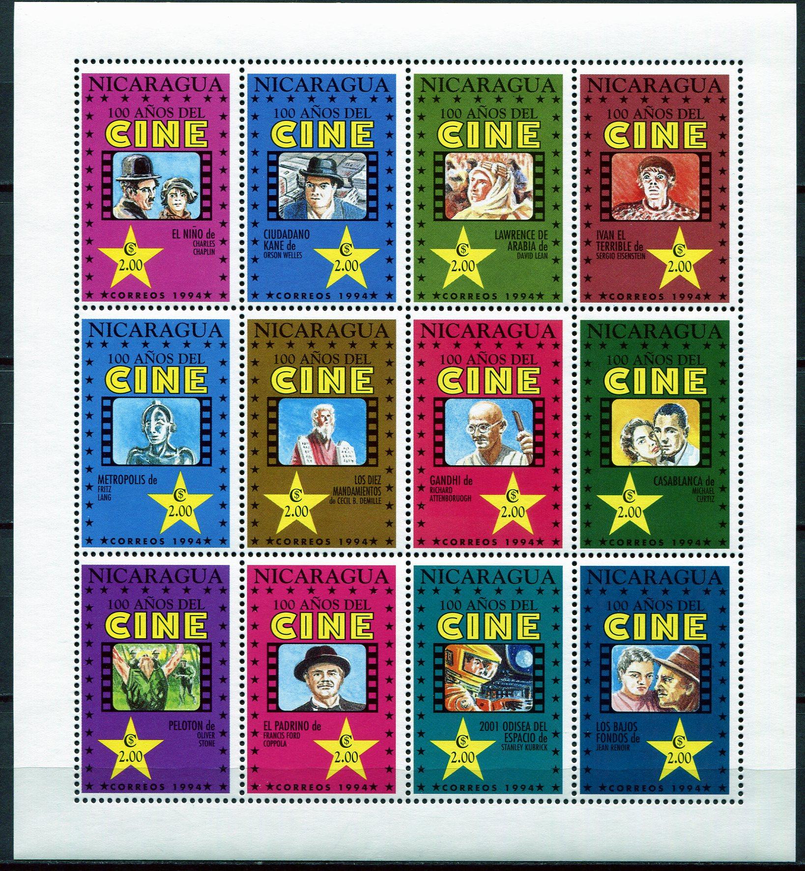 Почтовые марки. Никарагуа. 1994. Кино, 100-летие. МЛ. № 3435-46 (Mi: 12.00 Евро).