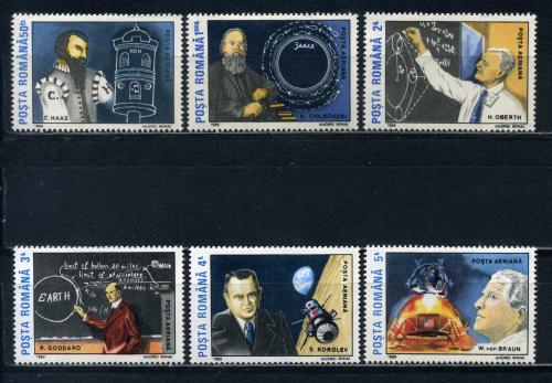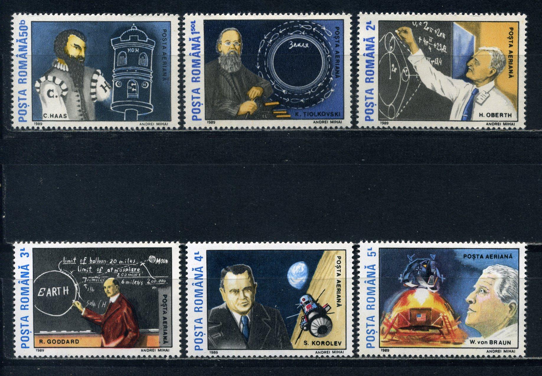 Почтовые марки. Румыния. 1989г. Учёные и конструкторы. Циолковский. Королёв. №4575-4580.