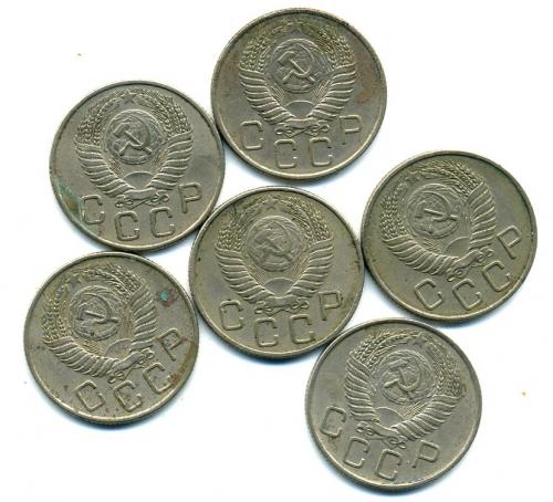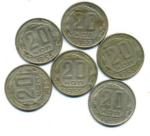 Монеты СССР. 20 копеек 1955 г 6 шт.