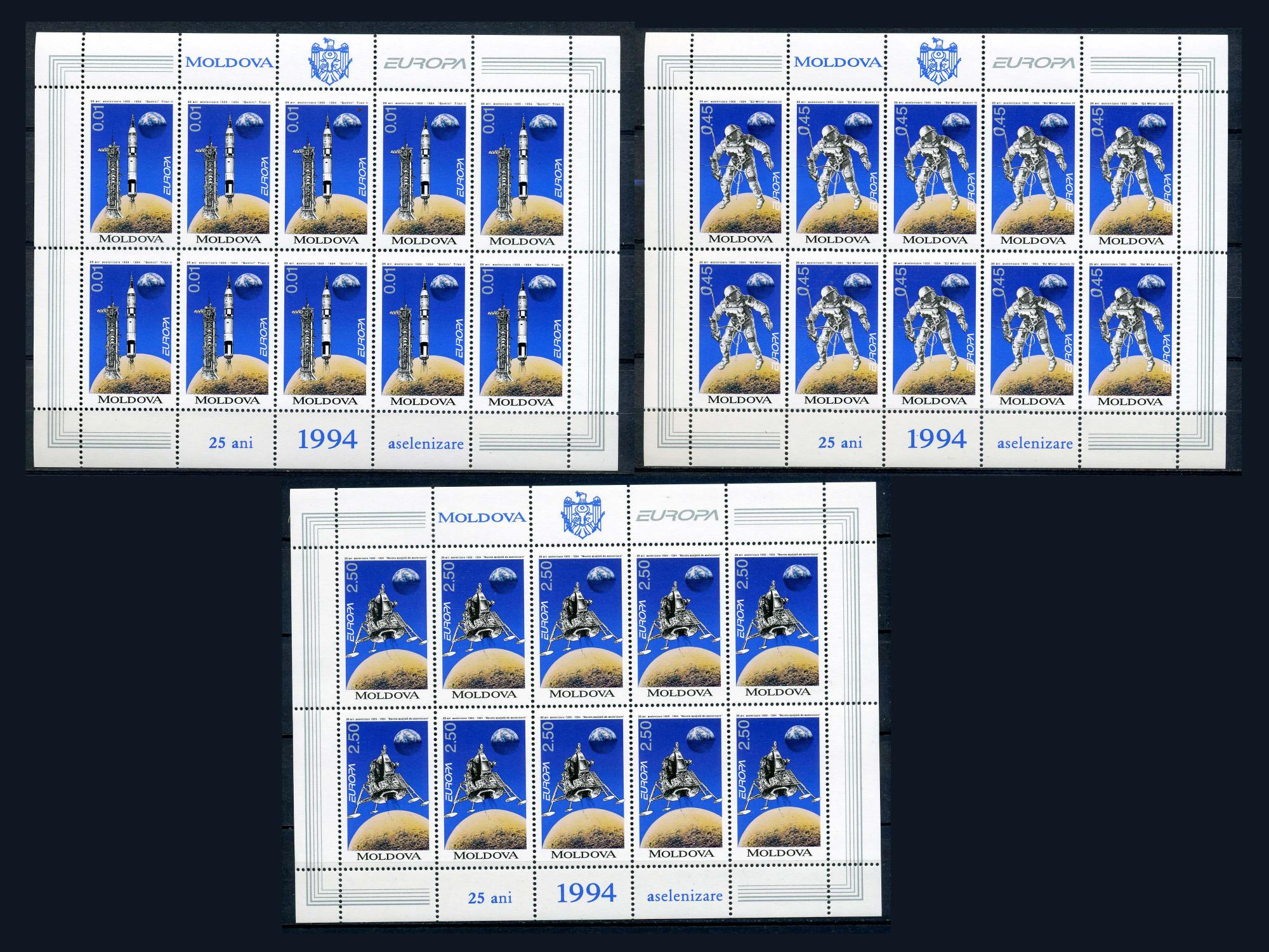 Почтовые марки. Молдова. 1994г. №106-108. Космос. Аполлон-11. Листы (Mi: 120.00 Евро).