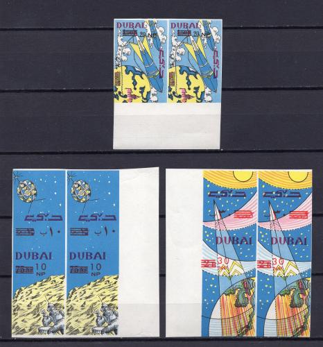 Почтовые марки. Дубай. 1964г. Космос. Надпечатка. №157в-159в. Беззубц. Сцепки. (30,0 е)