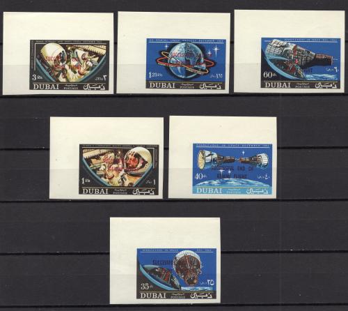 Почтовые марки. Дубай 1967г. Космос. Надпечатка Джемини-6. №237В-242В. Беззубц. (Mi : 25.00 Euro)