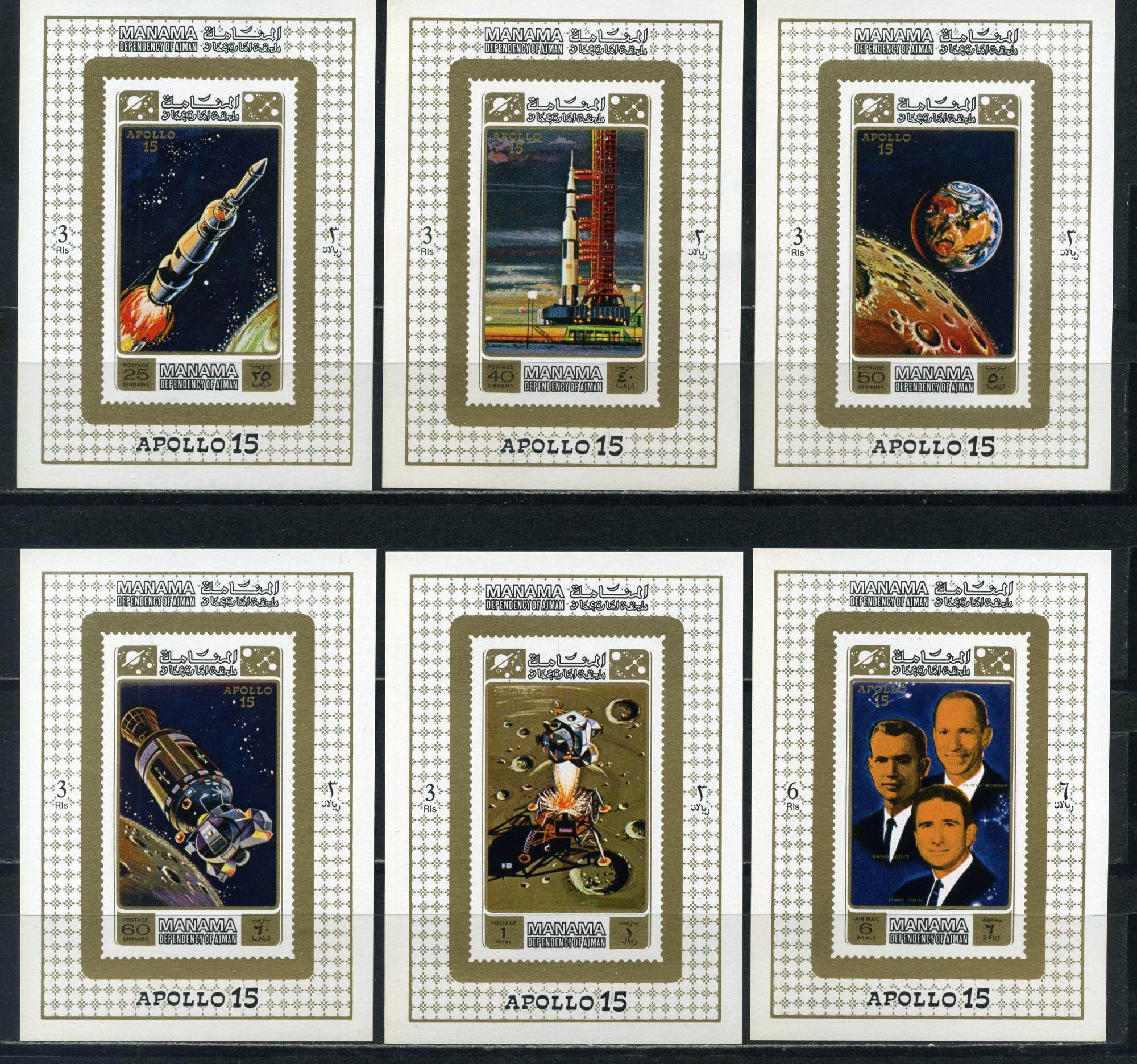 Почтовые марки. Манама. 1971г. Космос. Аполло-15. Люкс-блоки. №578-583. Беззубц.