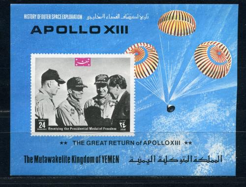 Почтовые марки. Йемен. 1970г. Космос. Аполло-13. Блок №24в. Беззубц.