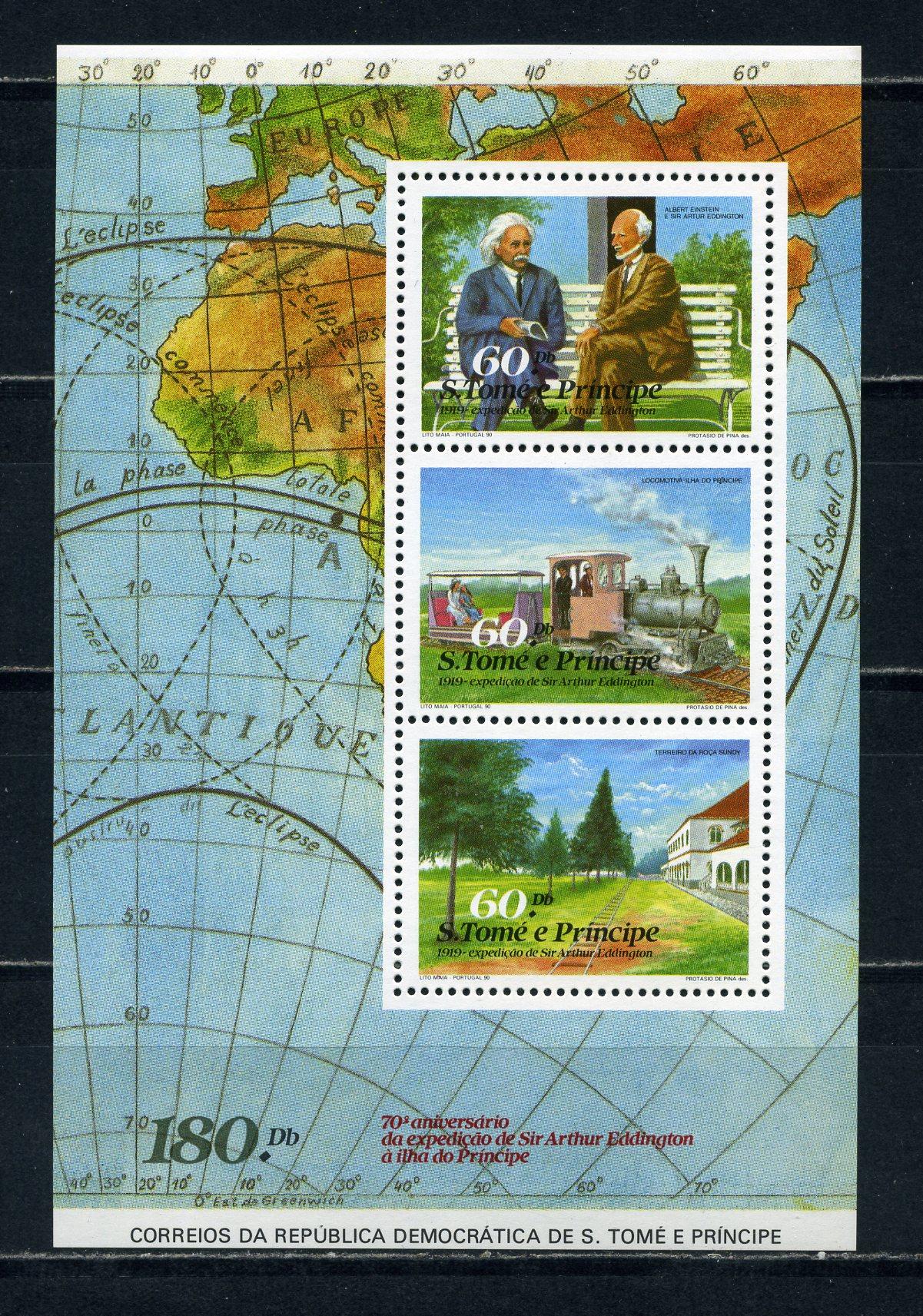 Почтовые марки. Сан-Томе. 1990г. Альберт Эйнштейн. 70-летие Экспедиции. Блок №227 (Mi: 25.00 Евро).