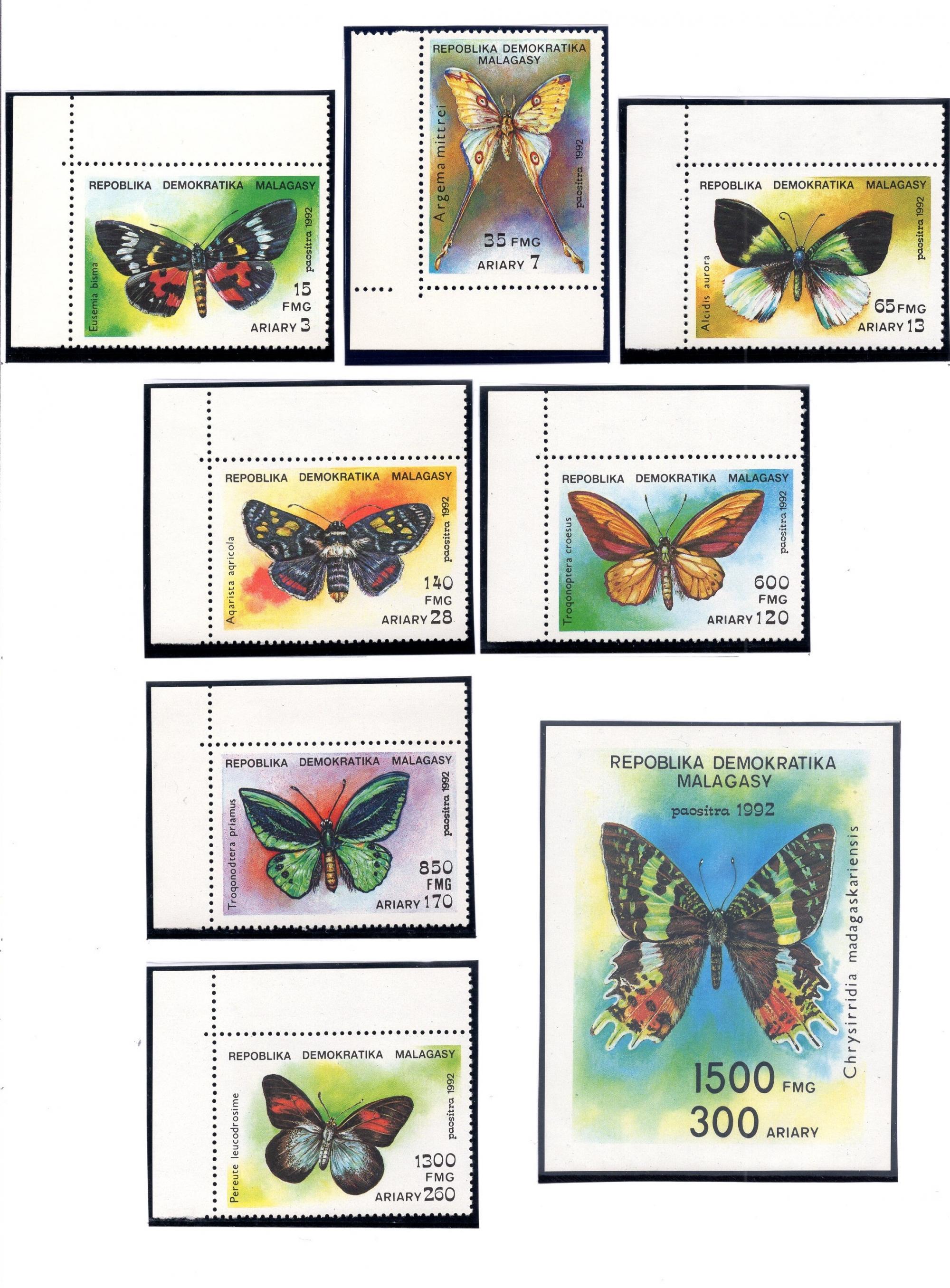 Почтовые марки. Демократическая Республика Мадагаскар, 1992 г. Бабочки. №1367-1373. Бл. 190