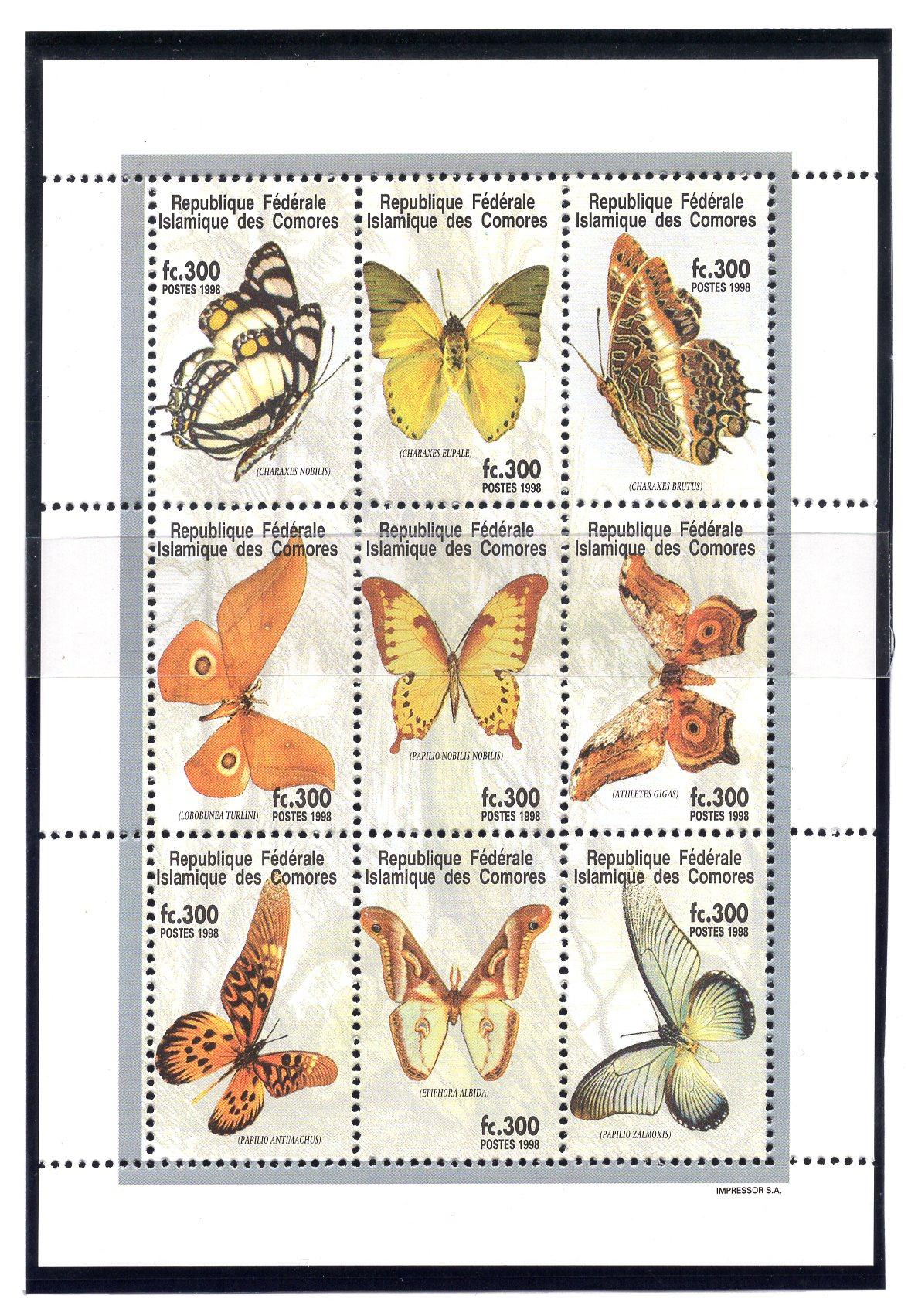 Почтовые марки. Коморы, 1998 г. Бабочки. №1365-1373.