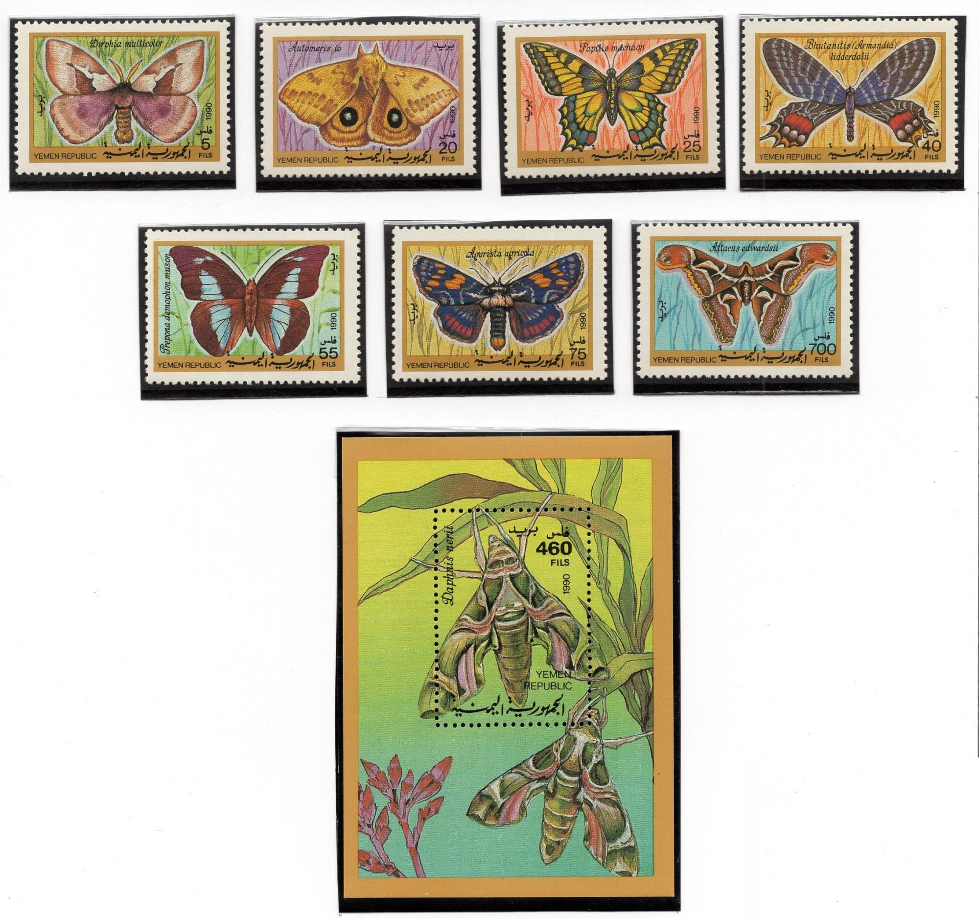 Почтовые марки. Йемен, 1990 г. Фауна. Бабочки. Насекомые. №15-21, Бл. 3 (20,0 е)