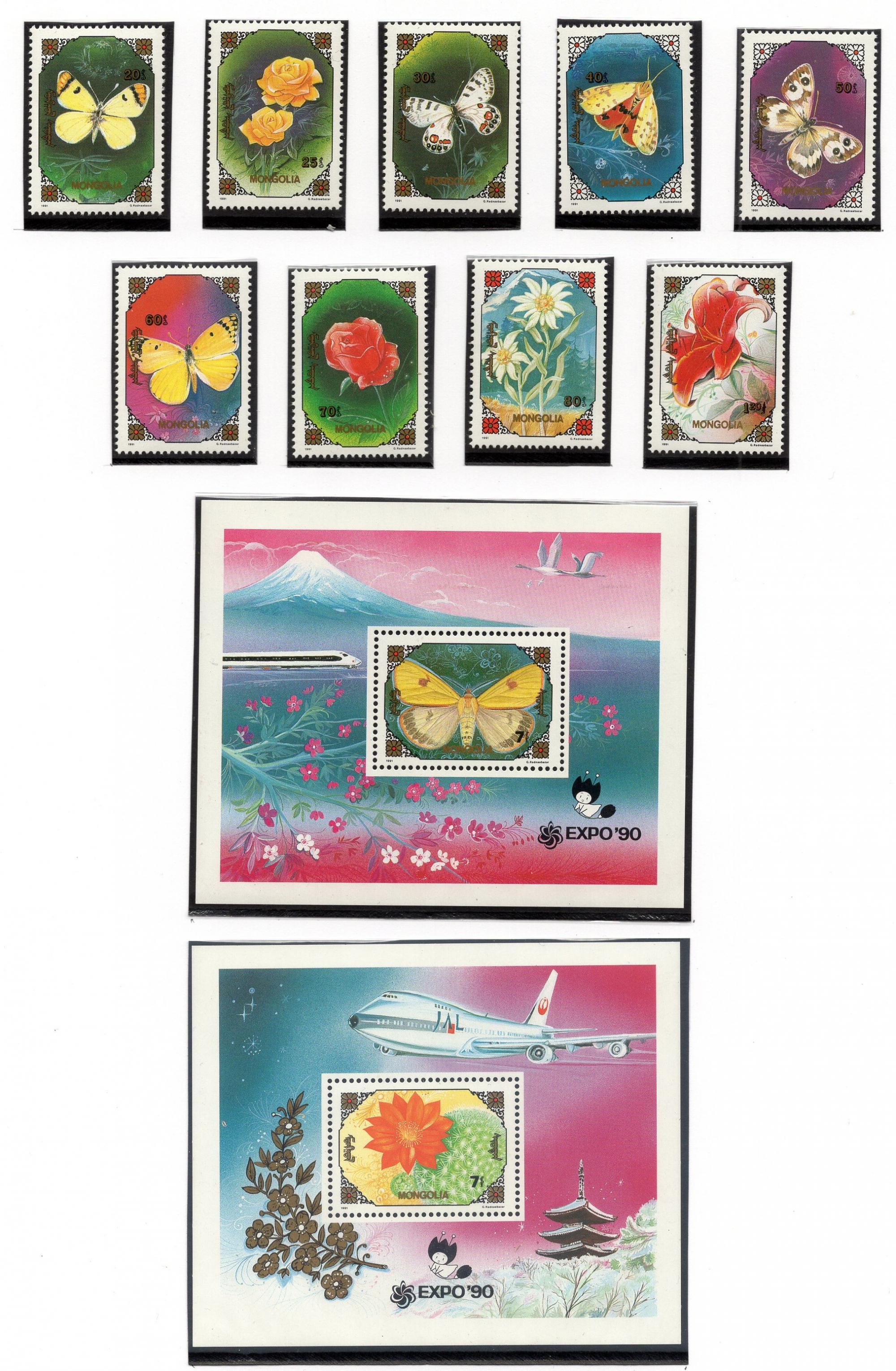 Почтовые марки. Монголия, 1991 г. Бабочки. Цветы. №2240-2248, Бл. 164-165.