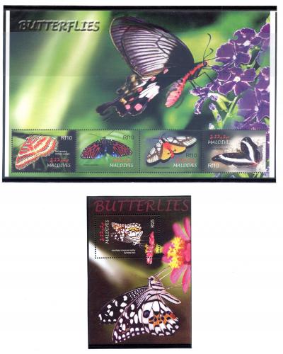 Почтовые марки. Мальдивы, 2004 г. Бабочки. №4416-4419., Бл. 582. 13,0 е