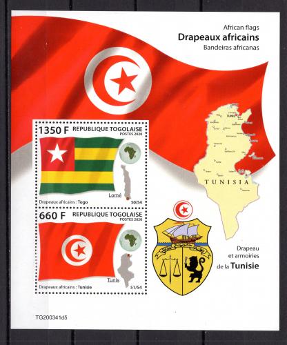Почтовые марки. Того, 2020 г. Некатал. Африканские флаги. Тунис.