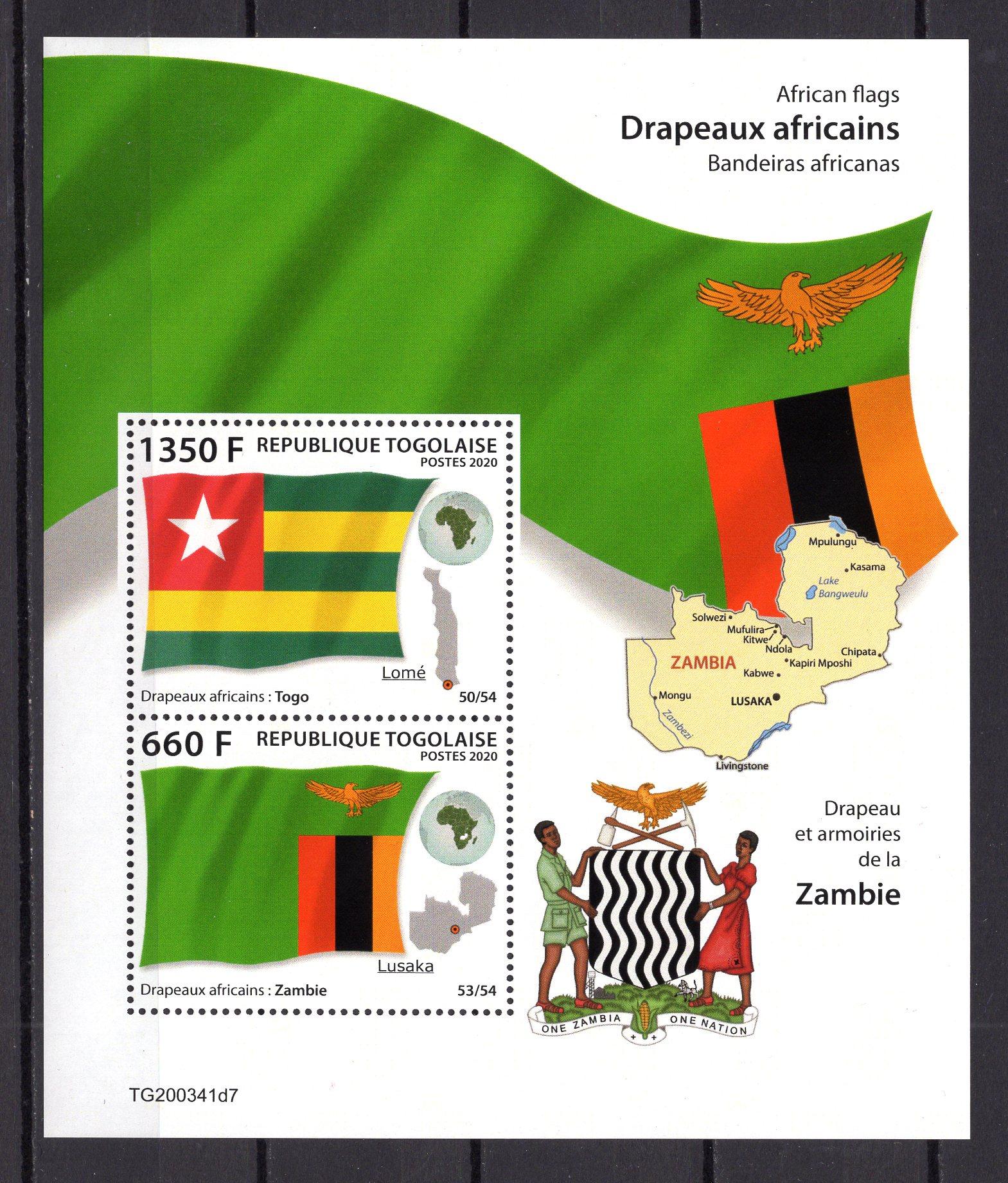 Почтовые марки. Того, 2020 г. Некатал. Африканские флаги. Замбия