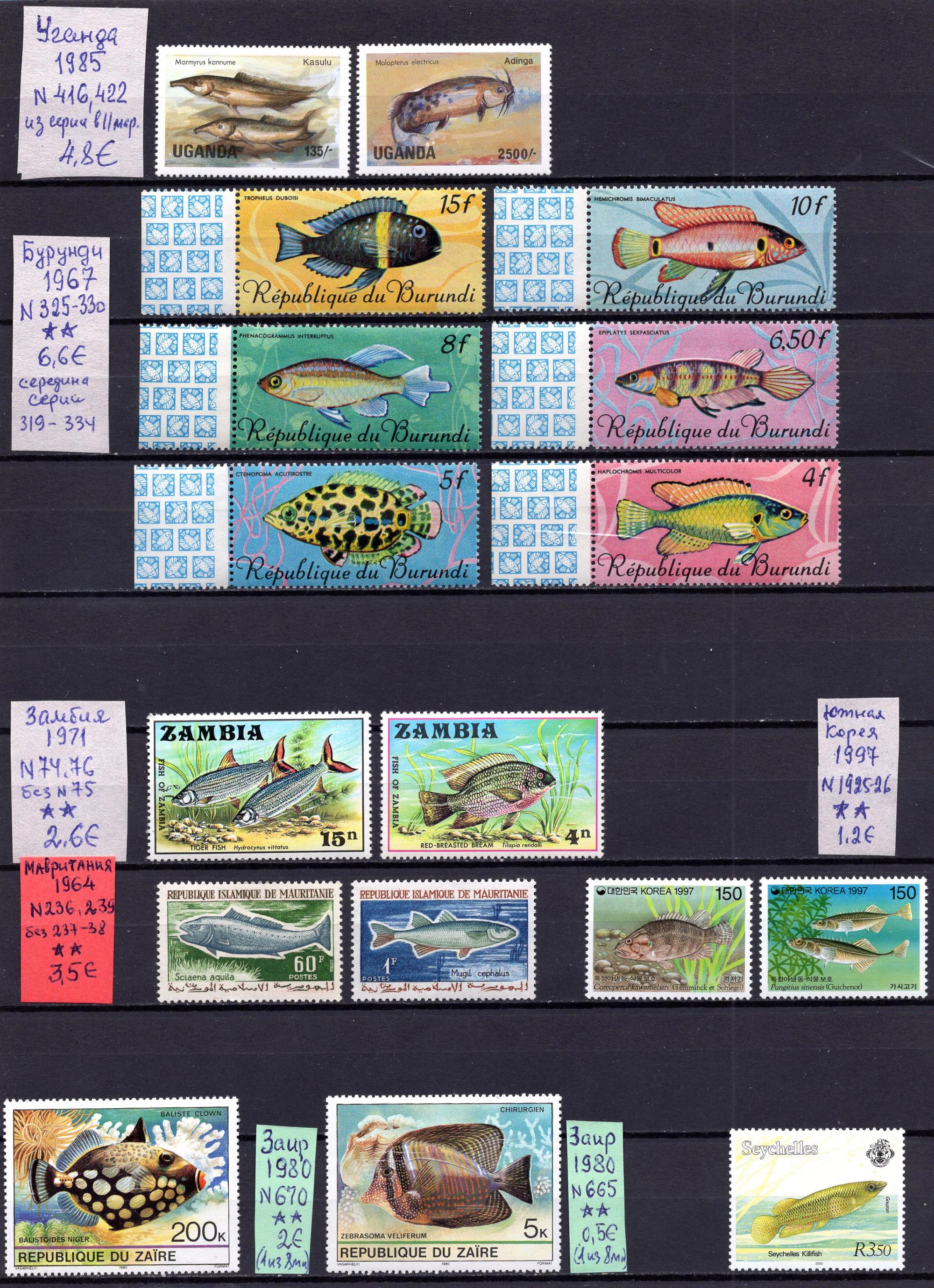 Почтовые марки. Сборный лот. Уганда, Бурунди, Замбия и др. Рыбы. 1964-
