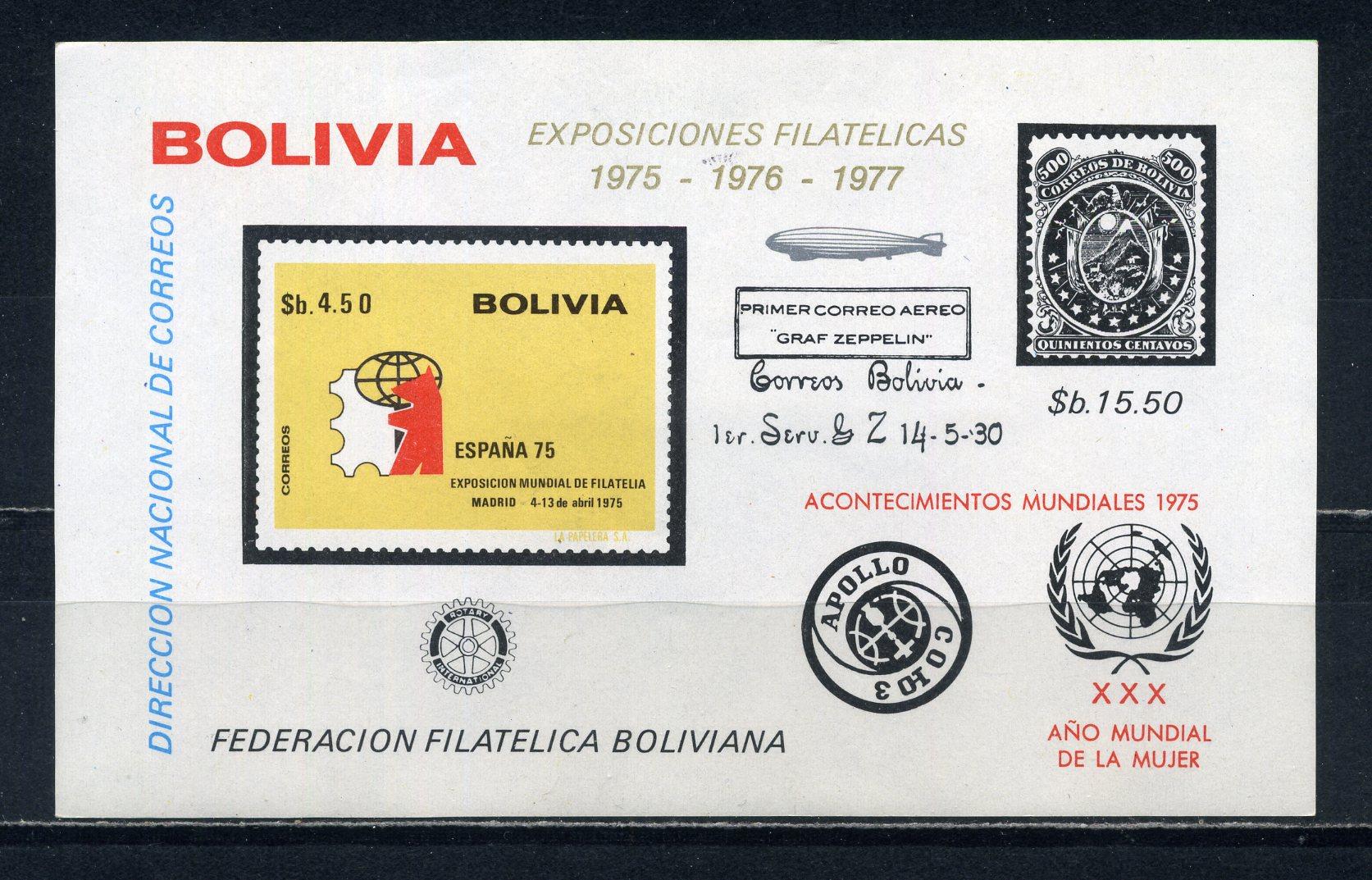 Почтовые марки. Боливия. 1975г. Филвыставка. Космос. Блок №54в. Беззубц. (Mi: 75.00 Евро)