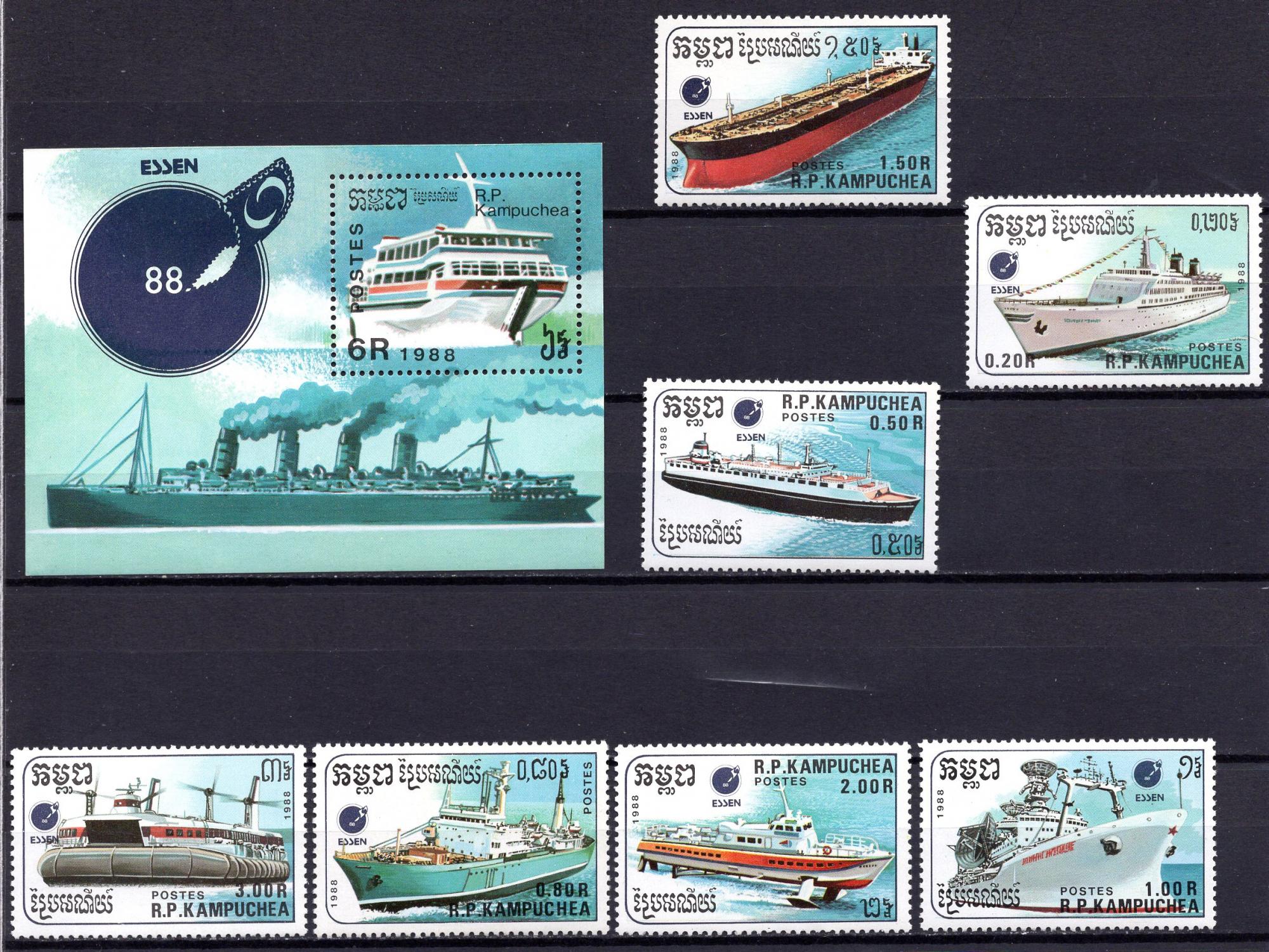 Почтовые марки. Кампучия, 1988 г. Корабли. №936-944, Бл. 159. (14,50 е)