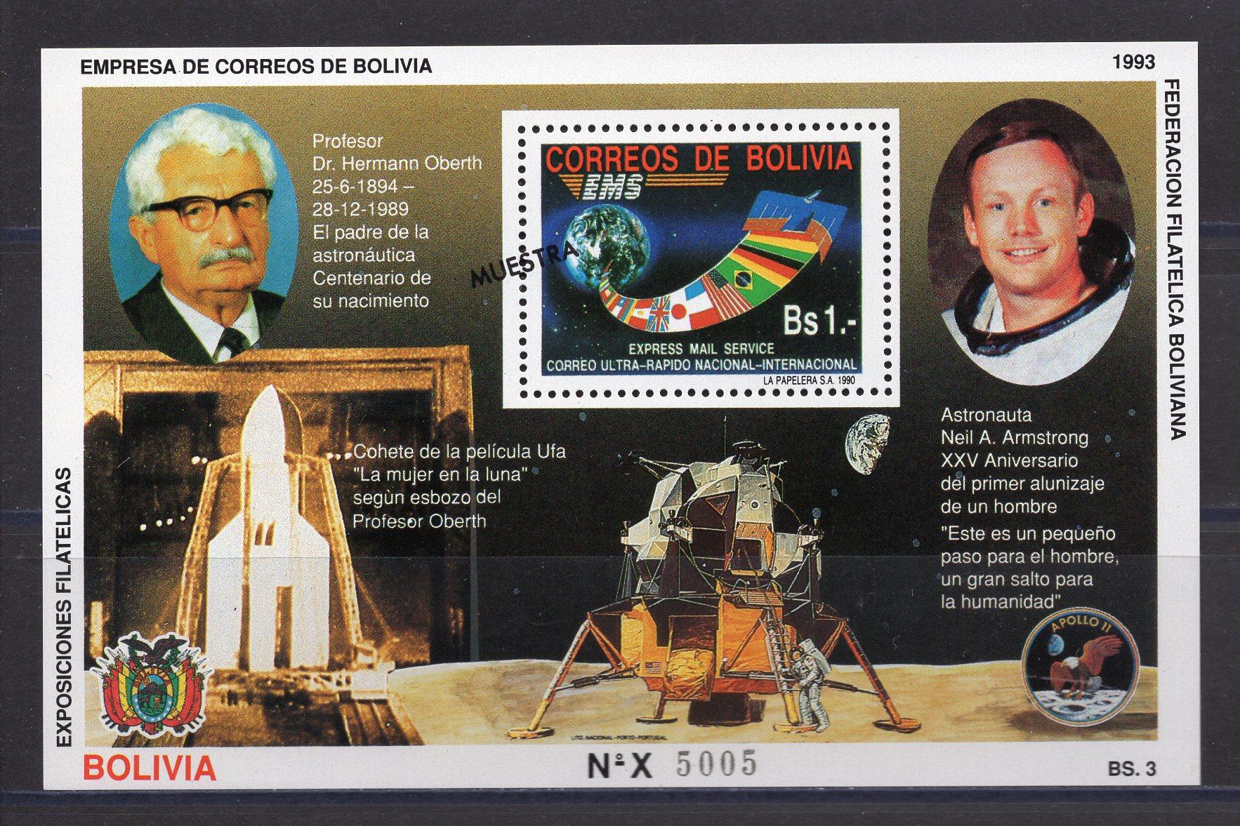Почтовые марки. Боливия. 1993г. Космос. Герман Оберт. MUESTRA.(образец) Блок №207.