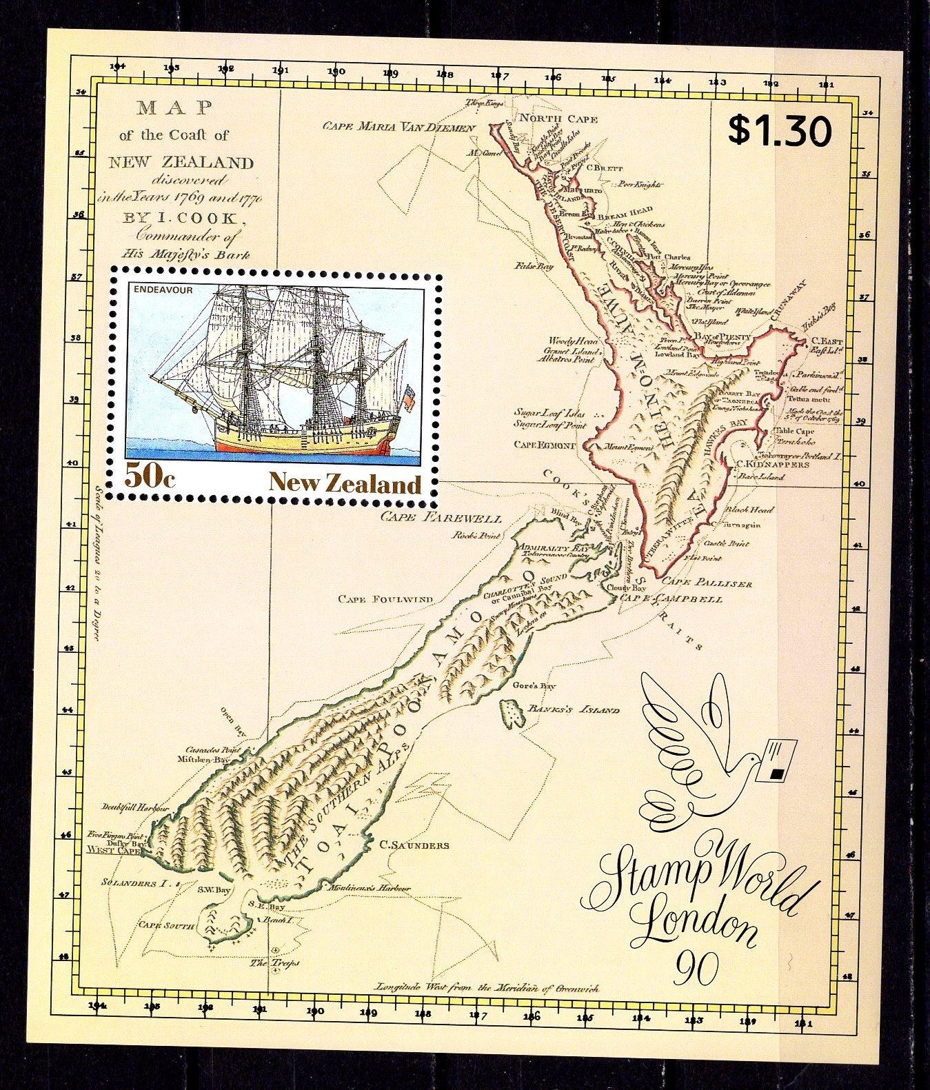 Почтовые марки. Н. Зеландия, 1990 г. Карты и корабли. Бл. 24. (18,0 е)