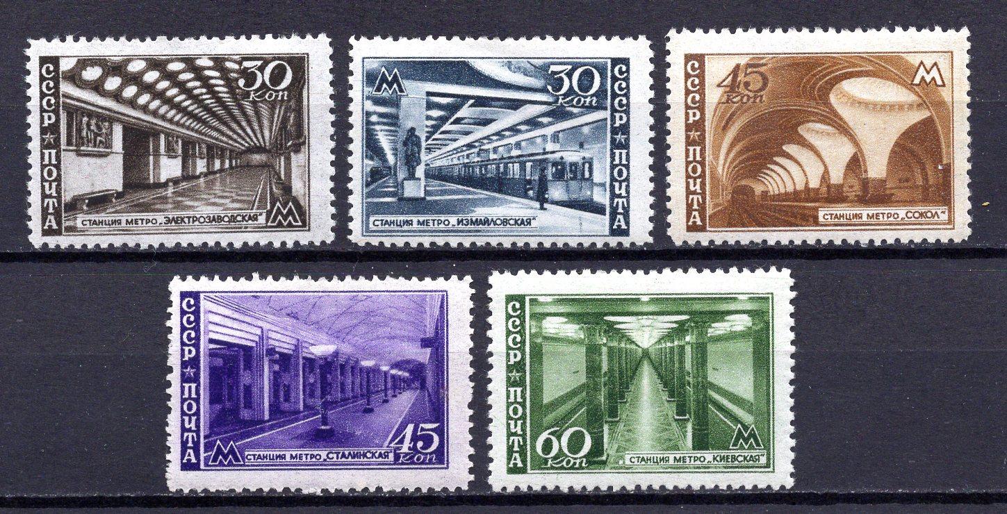 Почтовые марки. СССР, 1947 г. Метро. (См.сост фиолетовой марки. Посл. м. - с накл.). №1147-1151.