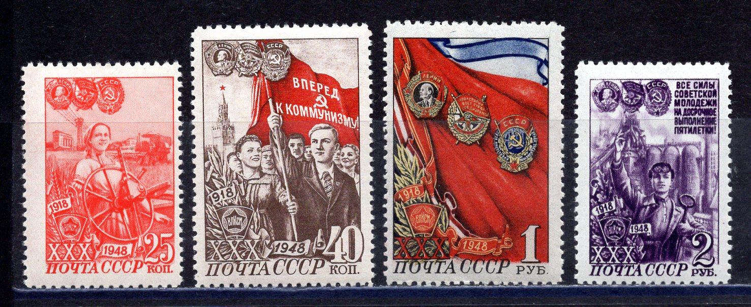 Почтовые марки. СССР. 1955г. 30-летие Комсомола. Гл. марка серии. №1323-1 - 1324-1, №1326-1 - 1327-1.