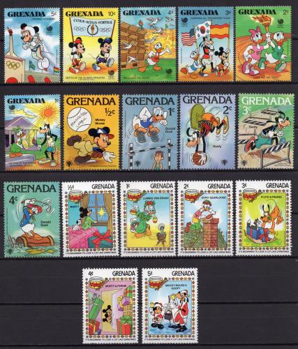 Почтовые марки. Гренада, 1979-1988 г. Мультфильмы. 3 серии. №991-995 etc. (Cм. сост. самая левая марка предпоследний ряд).
