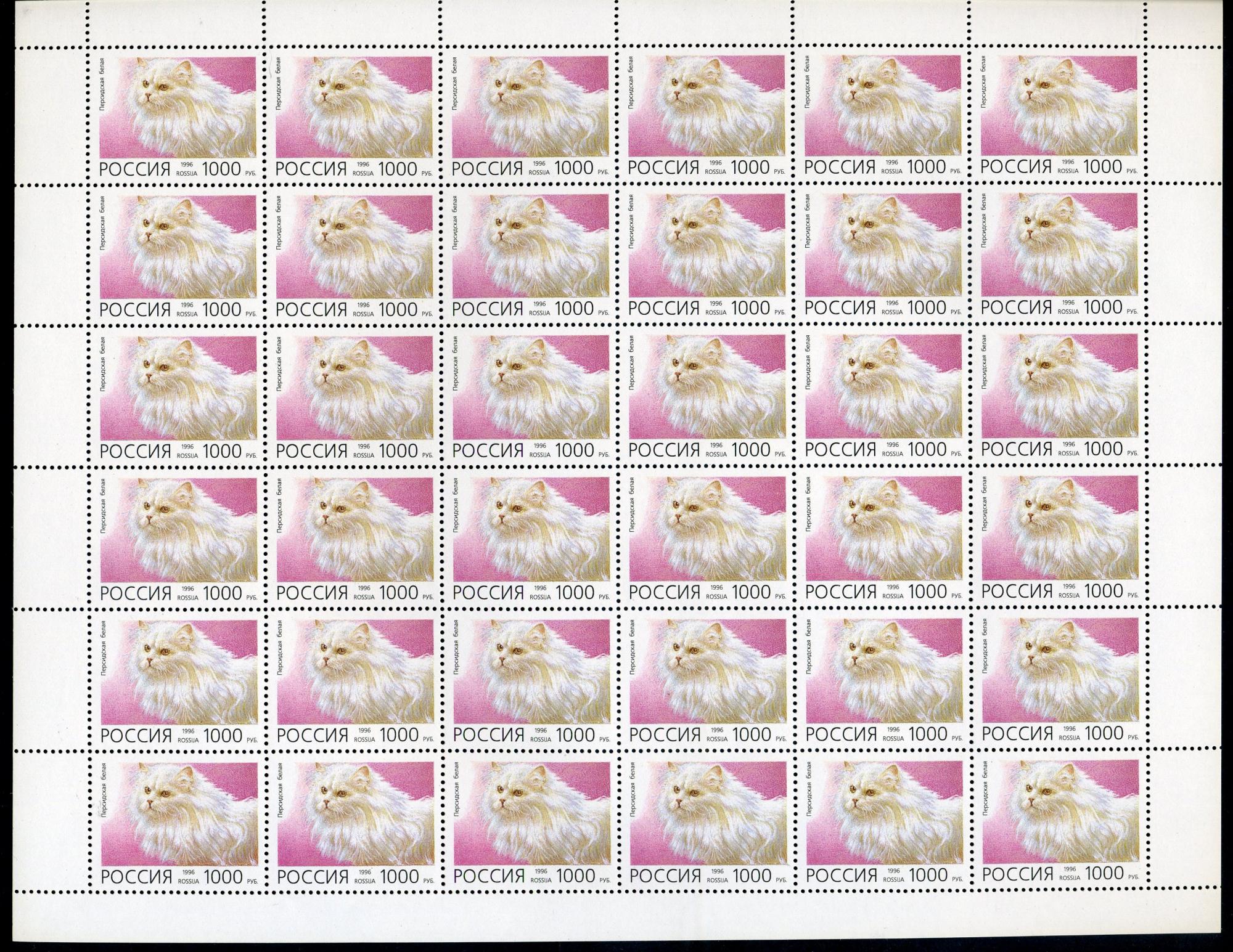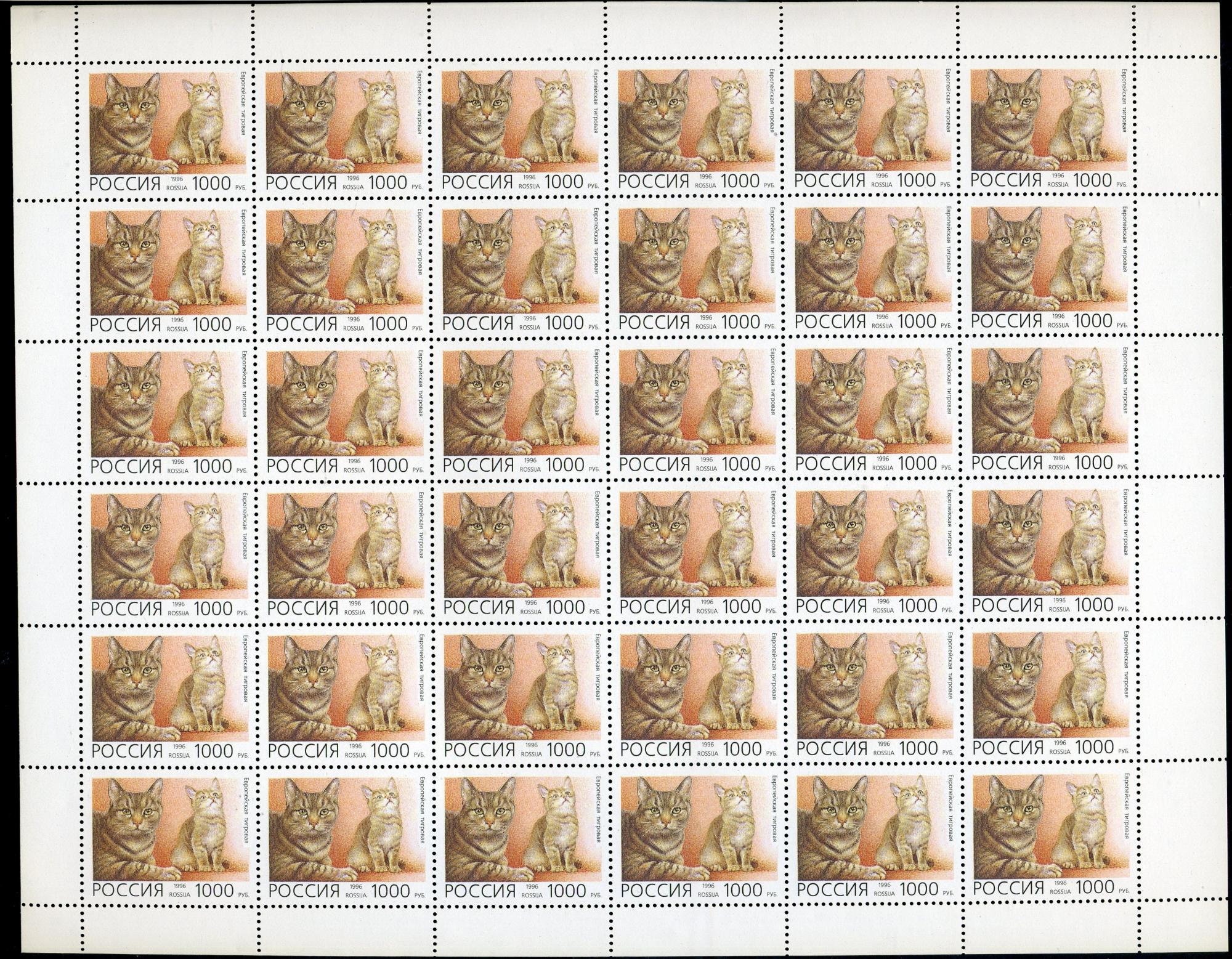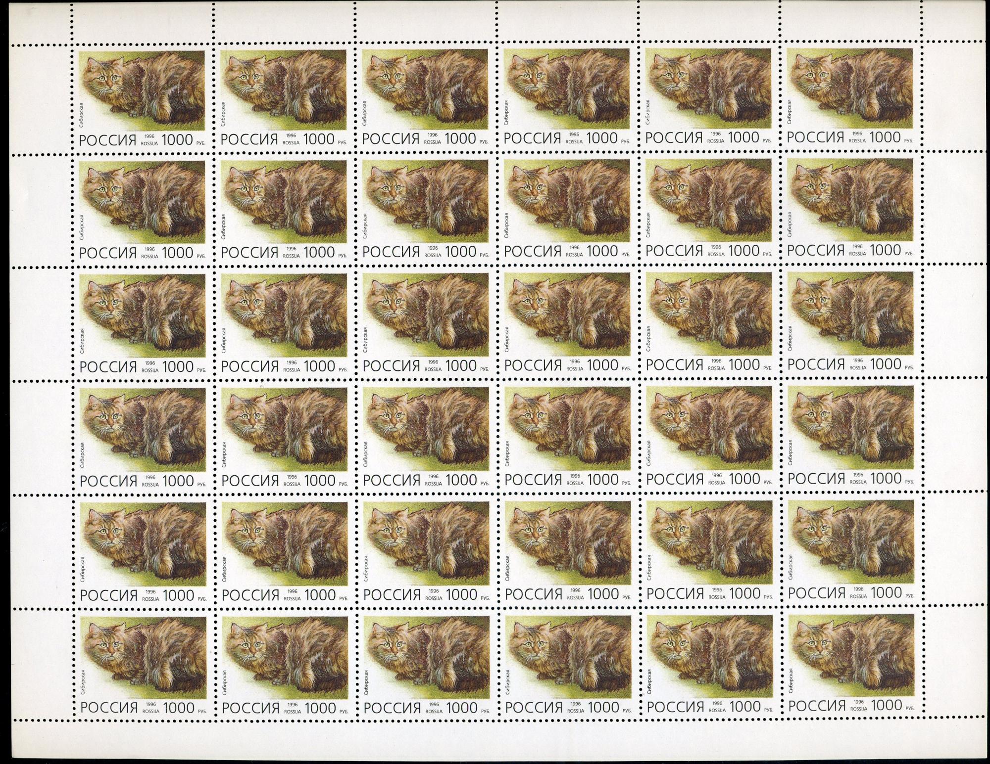 Почтовые марки. Россия 1996 г. Домашние кошки. № 266-270. 5 листов.