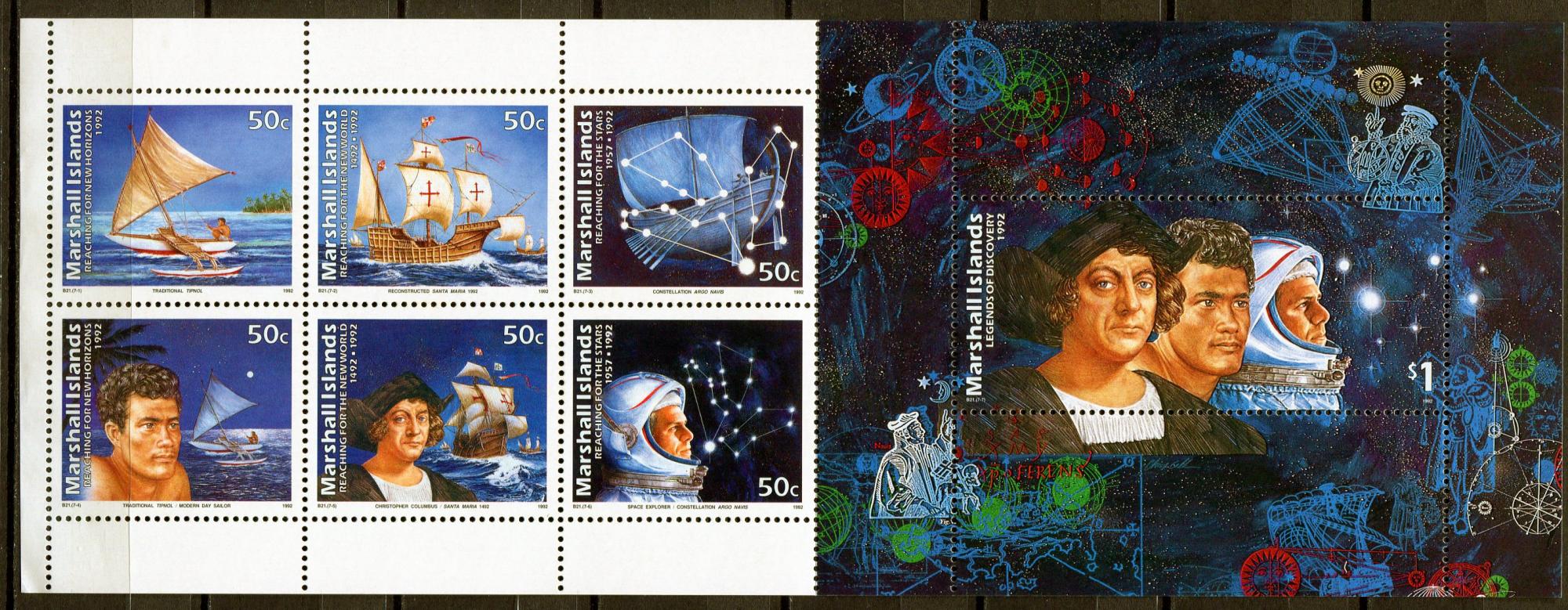 Почтовые марки. Маршаллы. 1992. 500-летие открытия Америки. Космос, 35-летие освоения. МЛ + люкс-блок. № 419-425.