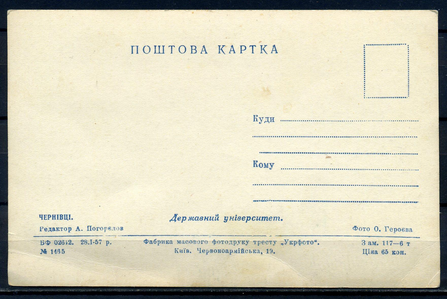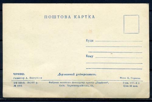 Почтовая карточка. СССР 1957 г. Черновцы. Гос.университет.