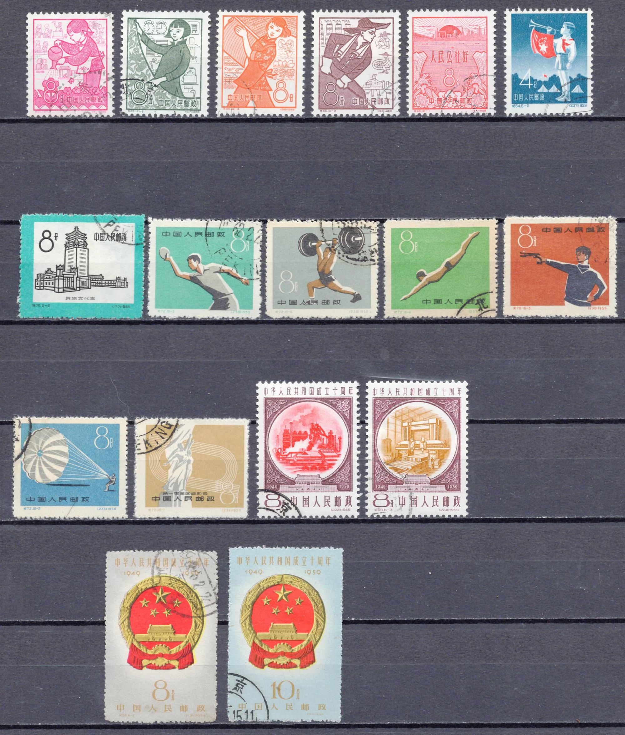 Почтовые марки. КНР, 1959 г. 1-я годовщина создания народных коммун. 10-я годовщина образования Китайской Народной Республики. Спорт. №454-457, 461, 470-471 etc.