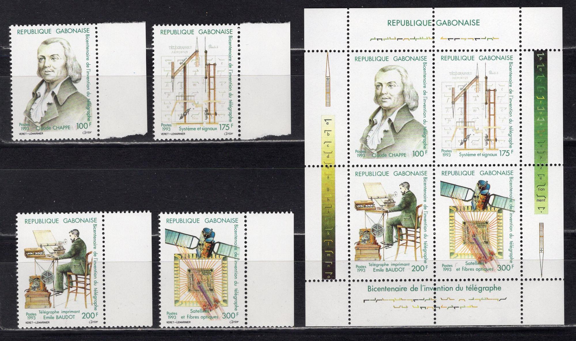 Почтовые марки. Габон. 1993г. 200-летие телеграфа. №1143-1146.+ Блок 75 (Mi : 17.00 Euro).