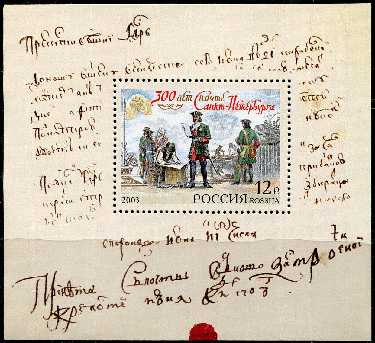 Почтовые марки. Россия. 2003. 300-летие почты С.-Петербурга. Блок. № 51.