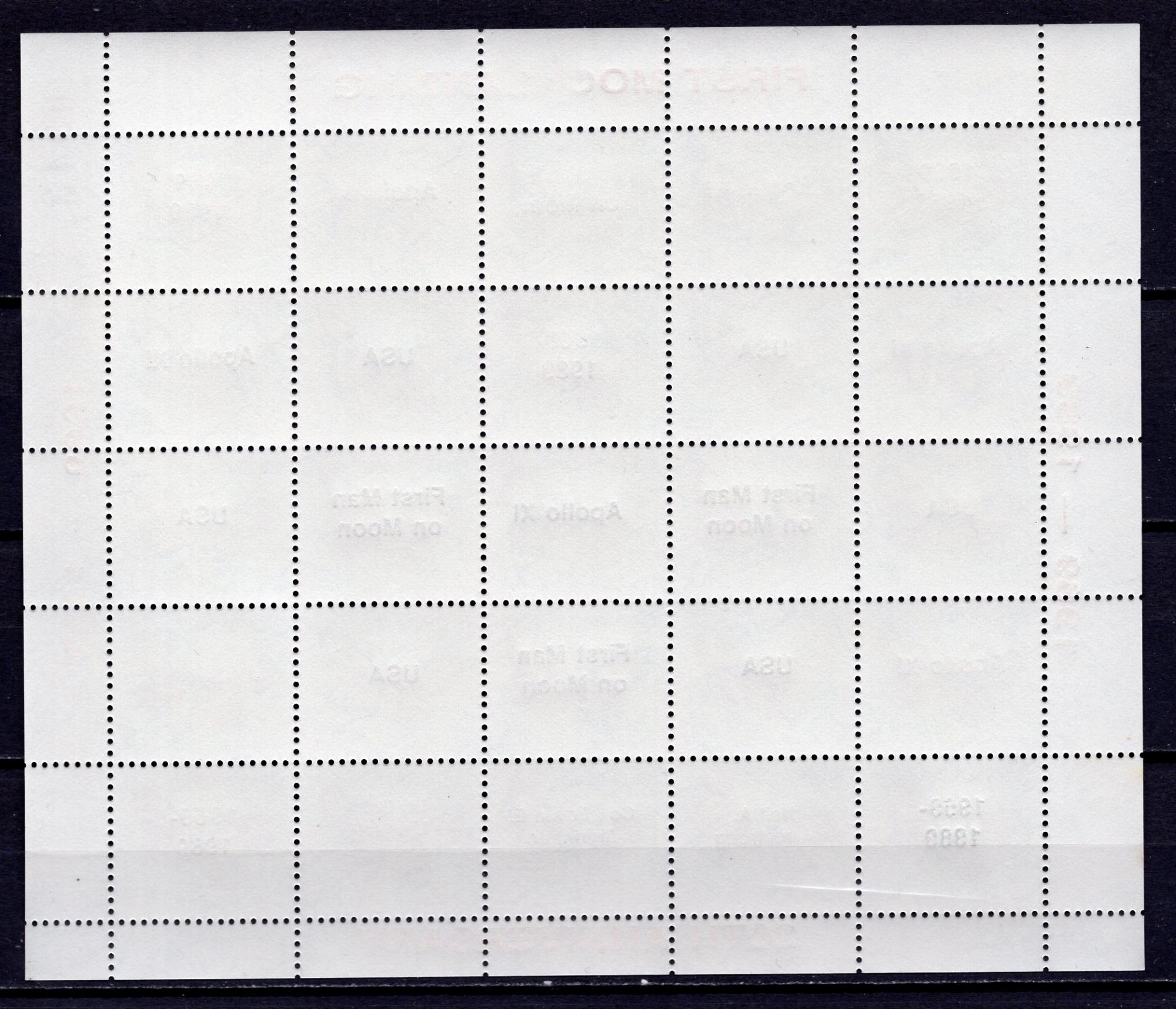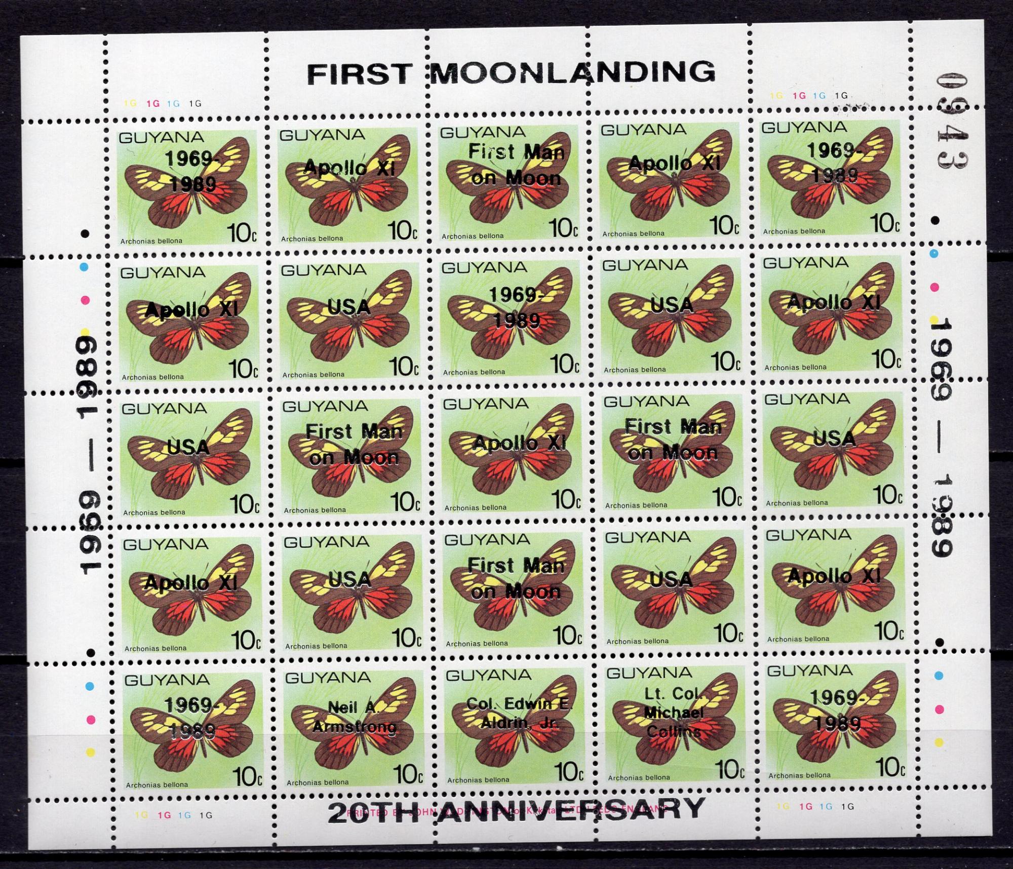 Почтовые марки. Гайана. 1989г. Бабочки. Надпечатка. Золото. Космос. Человек на Луне. №2652-2658. Лист.