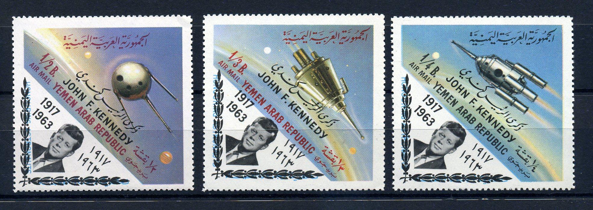 Почтовые марки. Йемен, Арабская Республика 1964 г. Космос. Кеннеди. Надпечатка. №332-334.